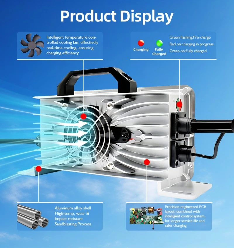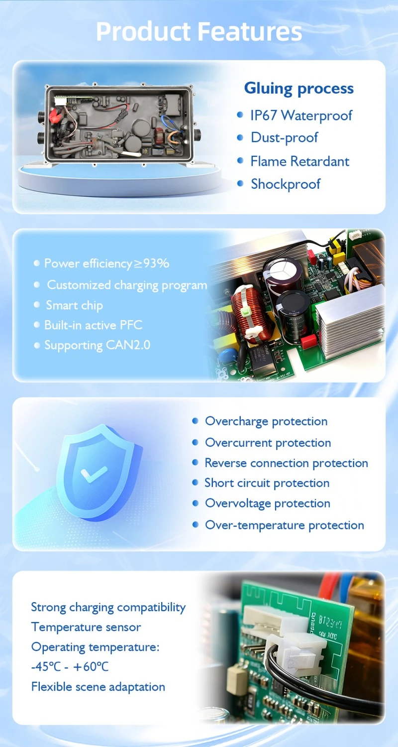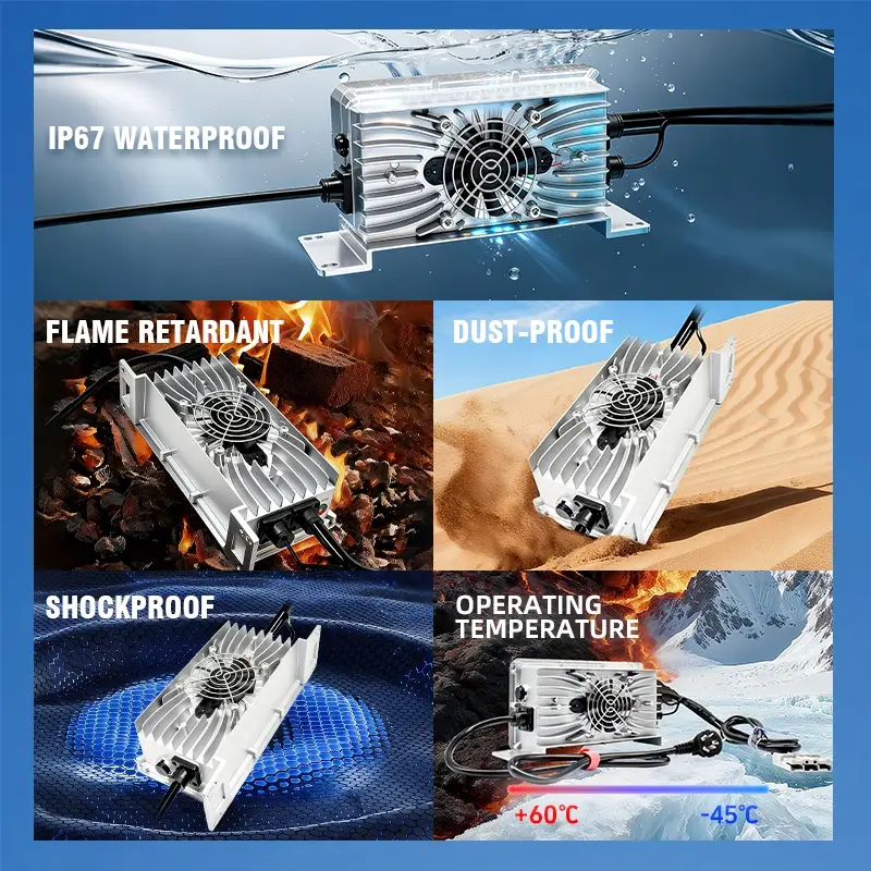 Cangkang paduan aluminium penuh meningkatkan efisiensi pembuangan panas sebesar 35% dibandingkan dengan cangkang plastik, menjaga suhu pengoperasian pengisi daya di bawah 60℃ selama pengoperasian 1,2kW terus-menerus, sehingga melindungi komponen internal dan memperpanjang masa pakai. Selain itu, ia dilengkapi dengan mekanisme perlindungan keselamatan multi-lapis, termasuk perlindungan tegangan berlebih (maks 55V), perlindungan arus berlebih (maks 28A), perlindungan hubung singkat, dan perlindungan suhu berlebih, yang secara efektif mencegah kerusakan pada pengisi daya dan baterai, serta memastikan pengoperasian yang aman di semua lingkungan terpasang.