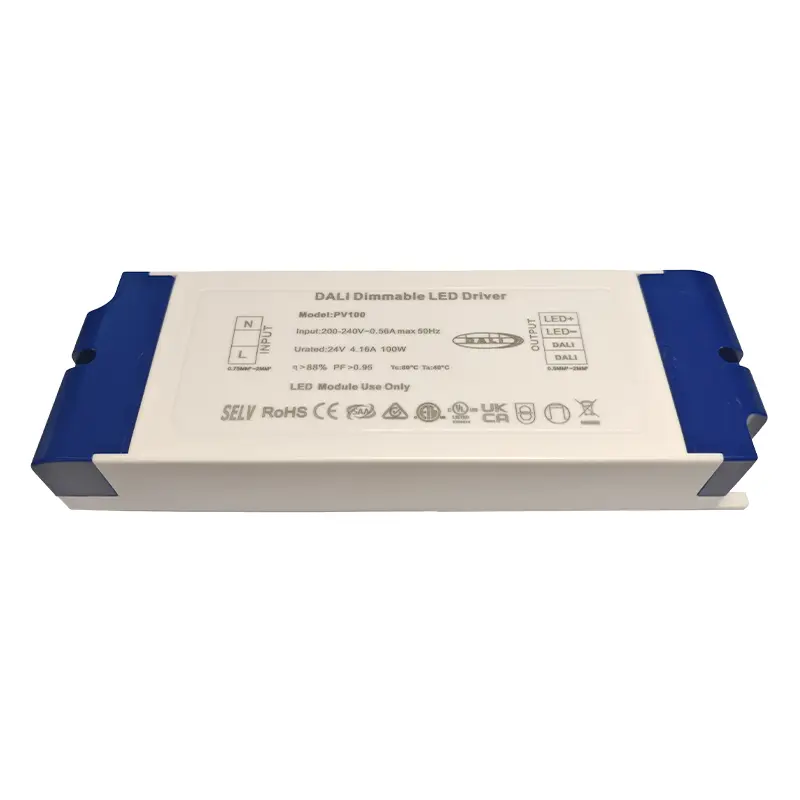 Sebagai produsen profesional Driver DALI Tegangan Konstan di Tiongkok, Starwell dapat memberi Anda Driver DALI Tegangan Konstan 100W berkualitas tinggi untuk aplikasi 24V yang dapat diredupkan, yang menawarkan output DC 24V/4,16A yang stabil dengan efisiensi hingga 90%. Mendukung peredupan yang mulus dan bebas kedipan dari 100% hingga 0,1% dan dilengkapi fungsi perlindungan sirkuit pendek, tegangan berlebih, kelebihan beban, dan suhu berlebih yang komprehensif.