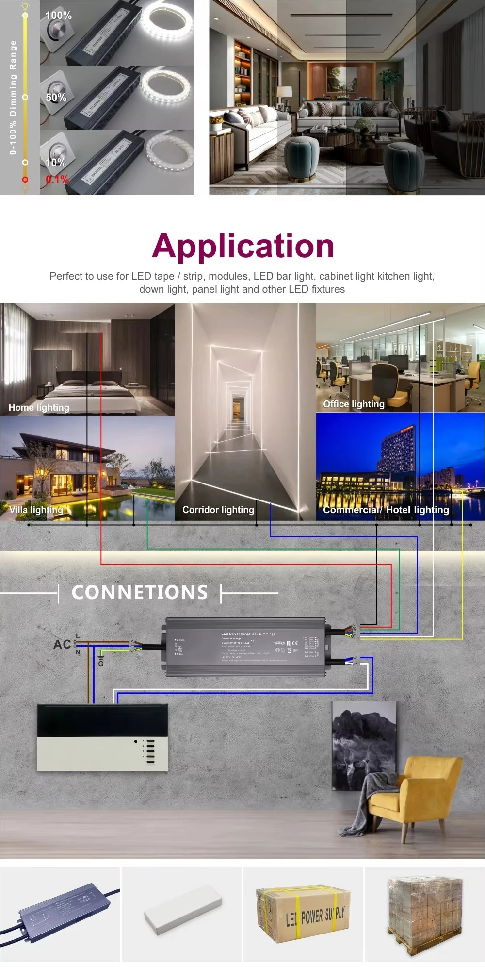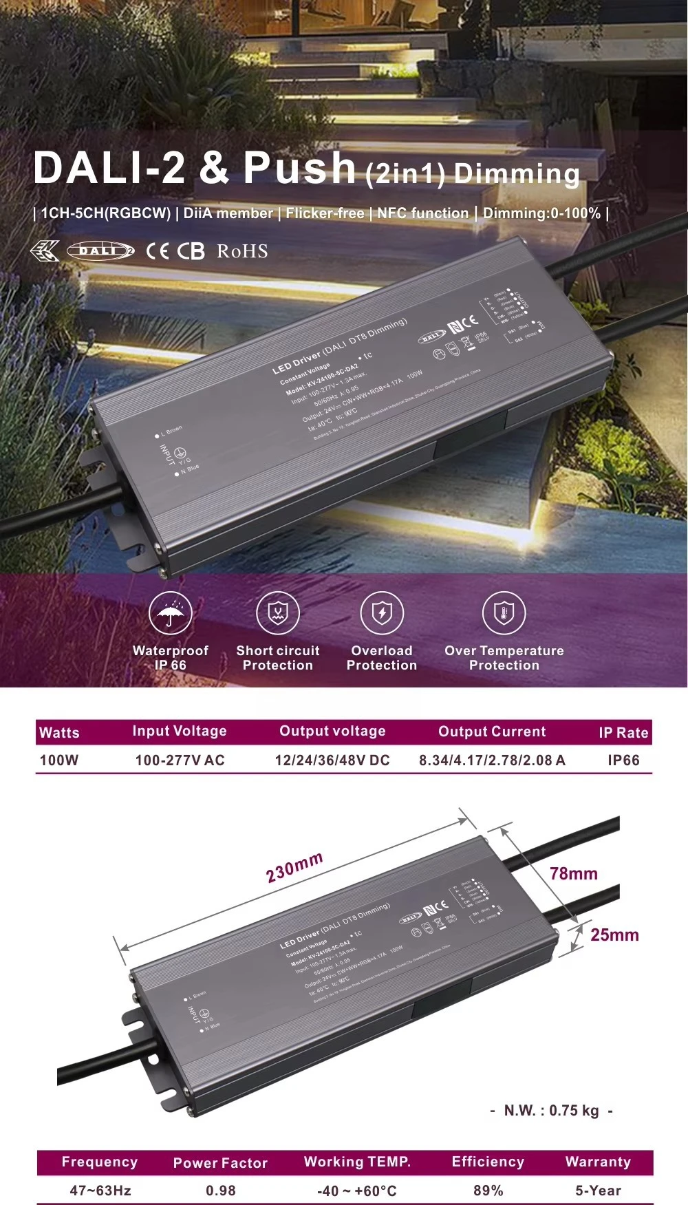 Starwell, produsen driver LED profesional di Tiongkok, Driver LED Peredupan CCT Tegangan Konstan DALI 100W kami ini bersertifikat DALI-2, menawarkan peredupan digital presisi dari 0,1% hingga 100% untuk kontrol cahaya yang lancar. Ini mencakup perlindungan penting terhadap korsleting, kelebihan beban, dan suhu berlebih, dengan pendinginan pasif melalui konveksi udara bebas.