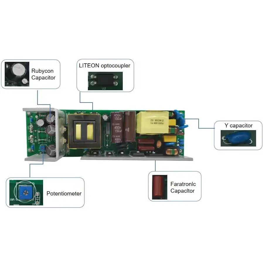 Perlindungan Empat Kali Lipat · Aman dan Terjamin: Pemantauan status sirkuit secara real-time, ambang perlindungan tegangan lebih>130% tegangan masukan, ambang batas perlindungan arus lebih>120% arus keluaran, suhu perlindungan panas berlebih>105℃, dan pemadaman langsung dalam 0,1 detik jika terjadi korsleting, sepenuhnya menghindari kerusakan peralatan dan bahaya keselamatan listrik.
