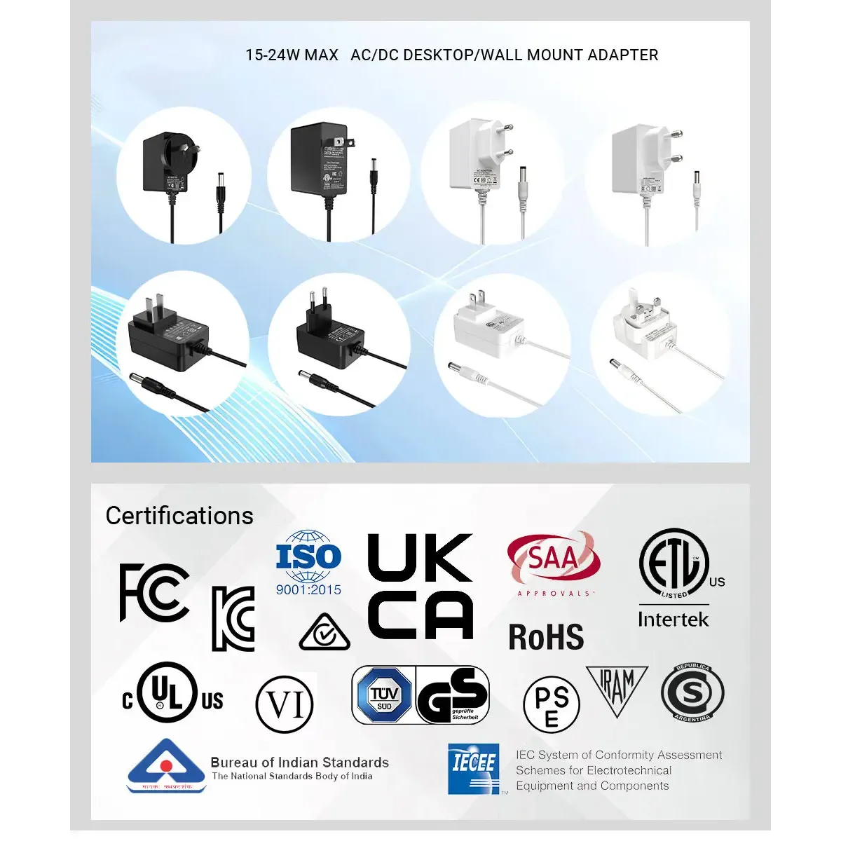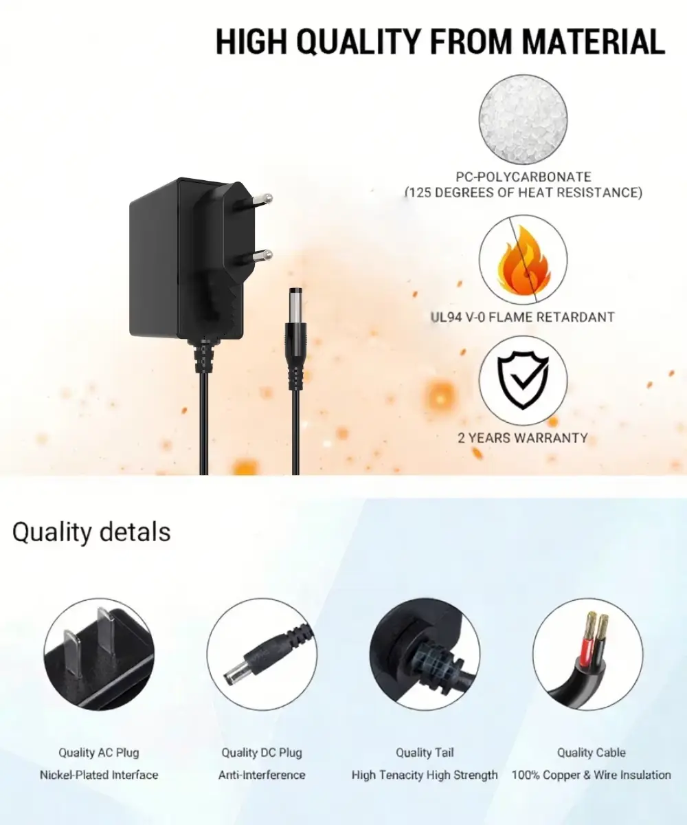 Seri adaptor daya 24W memenuhi standar internasional yang ketat dan memiliki sertifikasi global, termasuk sertifikat CE/FCC/UL/RCM/SAA/UKCE/KC/BIS/PSE, yang memastikan keselamatan dan kepatuhan terhadap lingkungan. Desain colokannya yang bergaya Eropa memungkinkan koneksi yang aman, sehingga mudah digunakan dalam berbagai pengaturan.