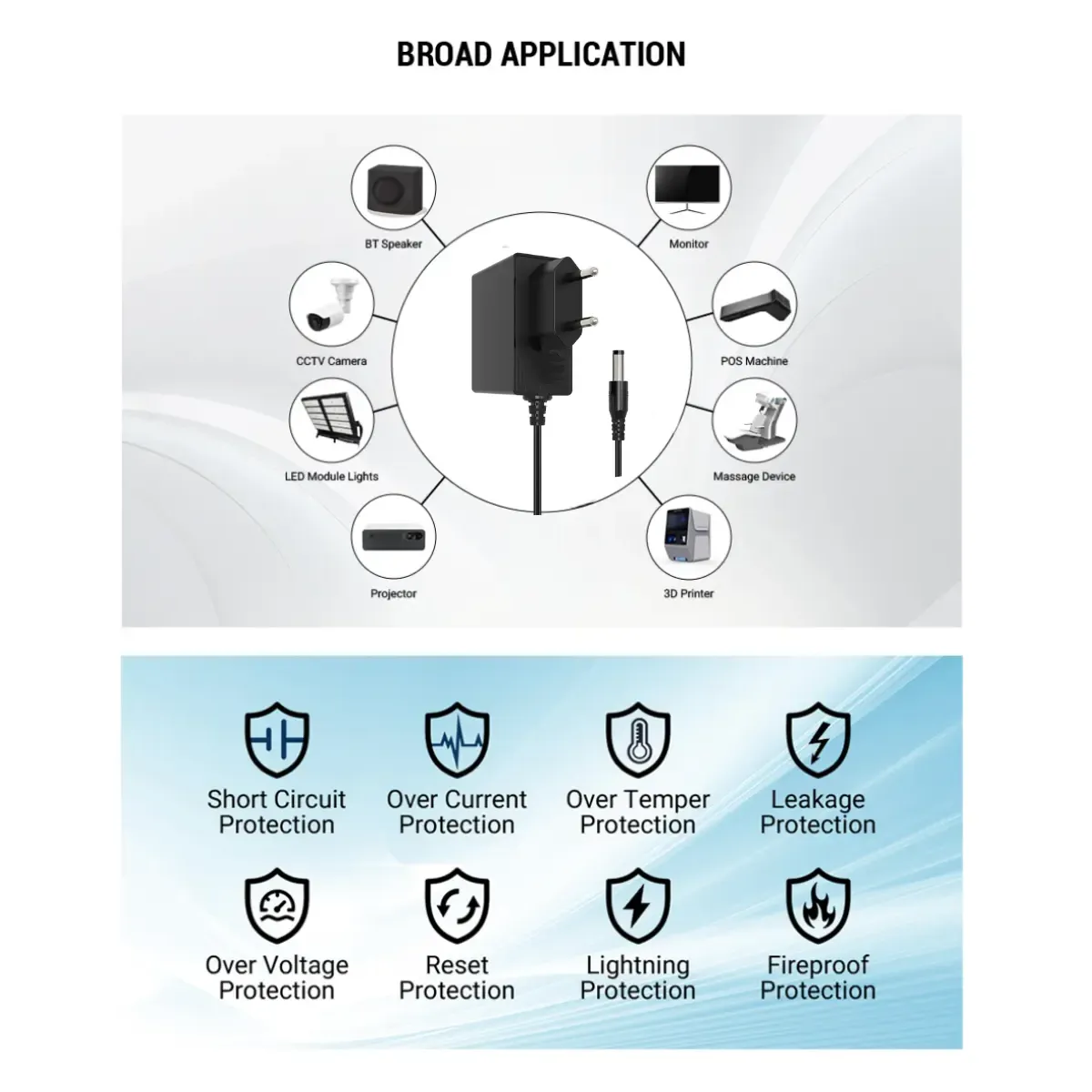 1. Jaminan Keamanan Komprehensif: Dilengkapi dengan berbagai perlindungan termasuk perlindungan arus berlebih, tegangan berlebih, korsleting, dan suhu berlebih, adaptor ini melindungi dirinya sendiri dan peralatan Anda yang terhubung dari gangguan listrik.