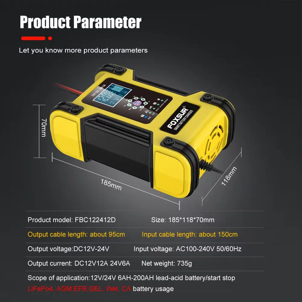 • Jenis baterai: Sebagian besar jenis baterai asam timbal termasuk Kalsium, Gel AGM, LiFePo4, Basah, Asam timbal, dll.