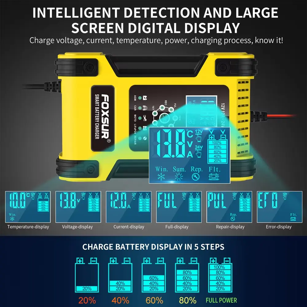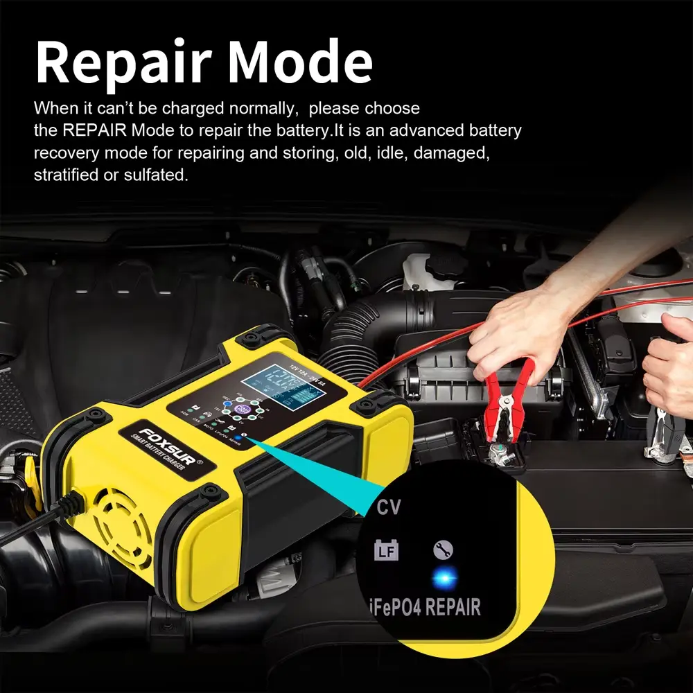Fungsi Perbaikan Cerdas: Mode desulfasi pulsa bawaan membantu memulihkan baterai yang tersulfasi dan memulihkan kapasitas yang hilang.
