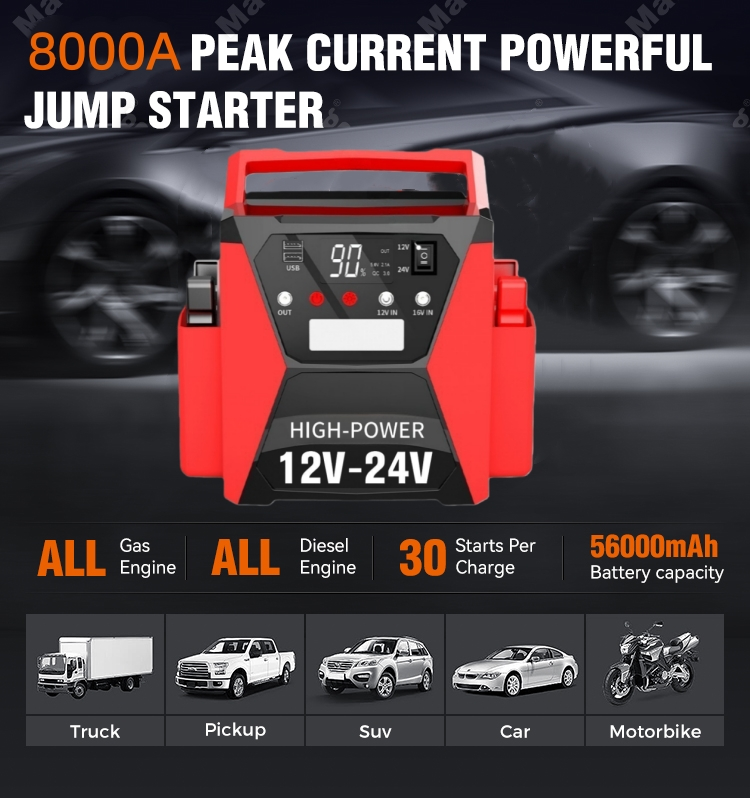 STARWELL memperkenalkan Pengisi Daya Baterai Cerdas Car Jump Starter 12V/24V berperforma tinggi, terobosan baru bagi pemilik kendaraan yang mencari keandalan dan kecerdasan dalam pemeliharaan baterai dan penyalaan darurat. Dilengkapi dengan arus puncak 8000A dan arus start 4000A, pengisi daya baterai cerdas bertegangan ganda ini menggabungkan daya yang kuat dengan teknologi pintar, sehingga cocok untuk semua mesin gas dan mesin diesel hingga 15L, mencakup mobil, truk, RV, sepeda motor, perahu, dan bahkan kendaraan komersial tugas berat.