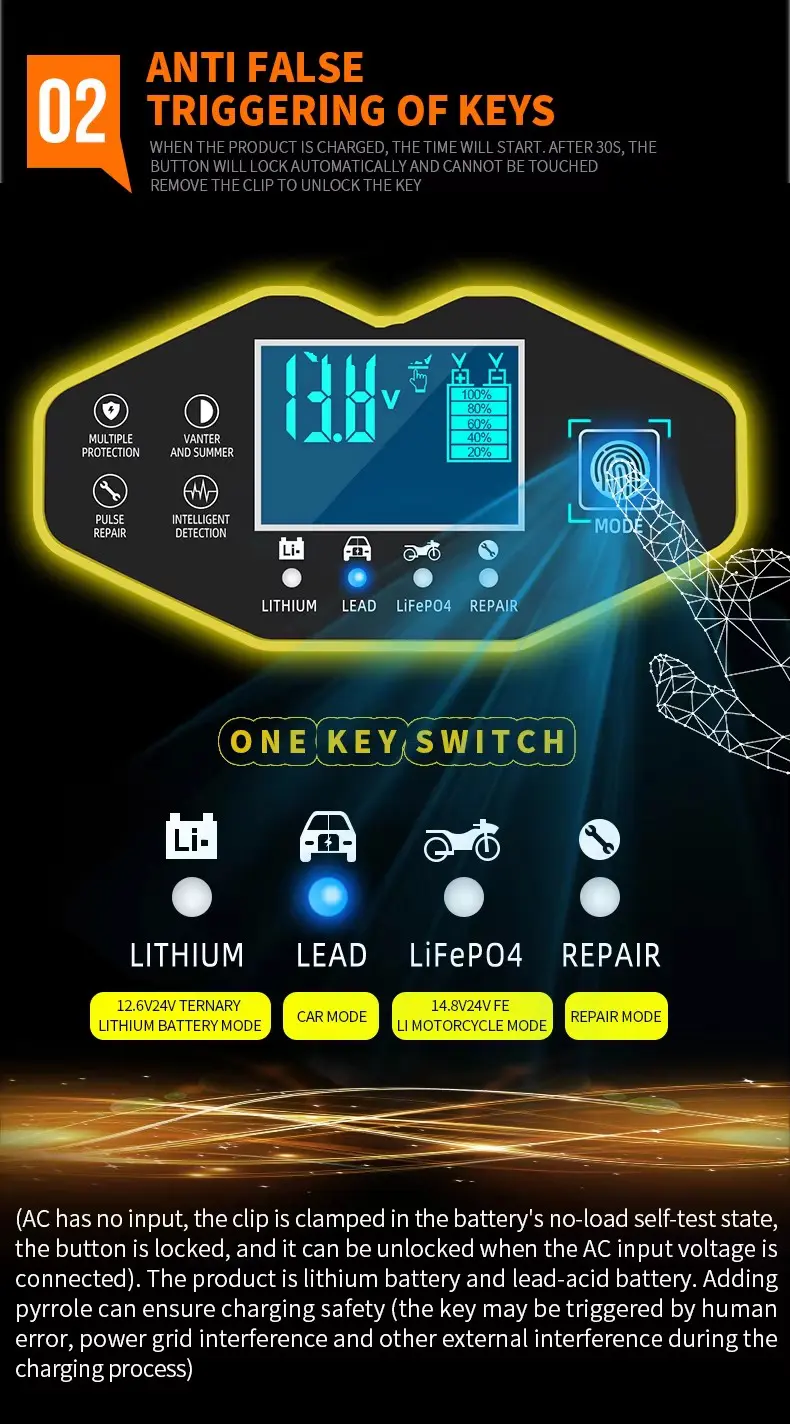 1. Cerdas & Kompatibel ZYX-J40 mendukung hampir semua jenis baterai di pasaran, termasuk timbal-asam, AGM, Gel, EFB, Li-ion, dan LiFePO₄ (lithium iron phosphate). Dengan rentang kapasitas yang luas dari 2Ah hingga 150Ah, dapat menangani segala hal mulai dari aki sepeda motor kecil hingga aki mobil besar.