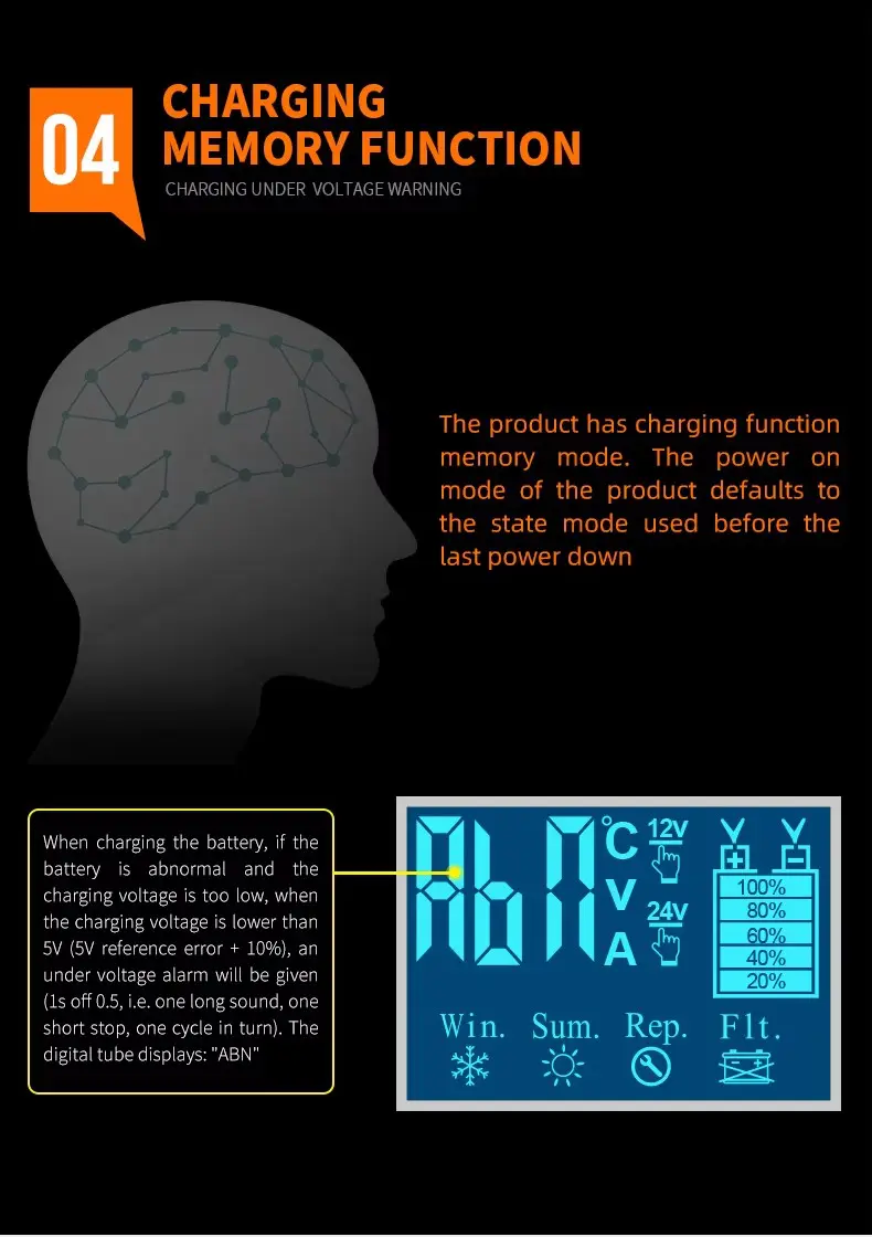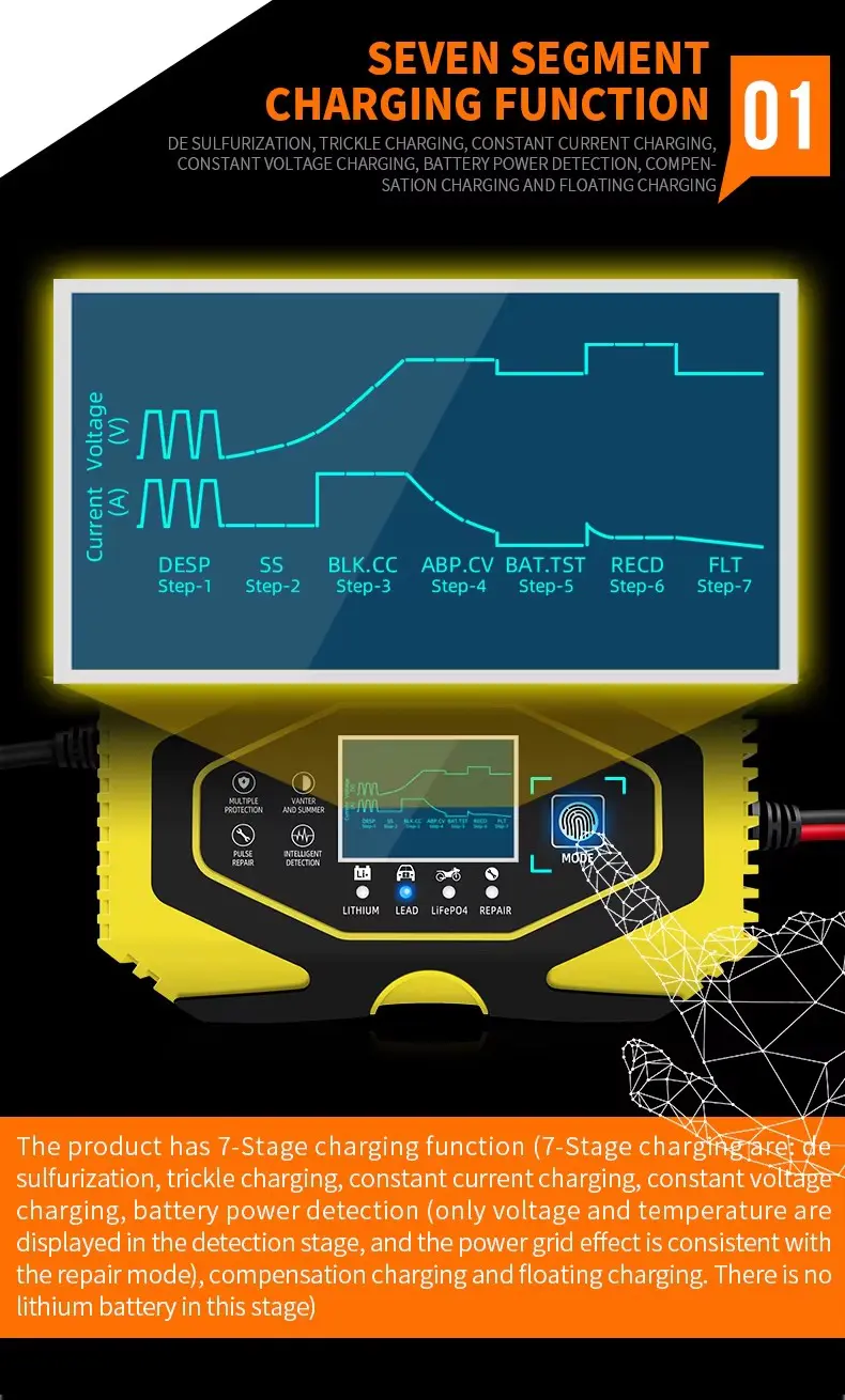 Pengisi daya 7 tahap cocok untuk sebagian besar jenis baterai termasuk Kalsium, Gel AGM, Basah, Lithium. Asam Timbal. Baterai LifePo4. Mereka juga dapat membantu memulihkan baterai yang terkuras dan tersulfasi.