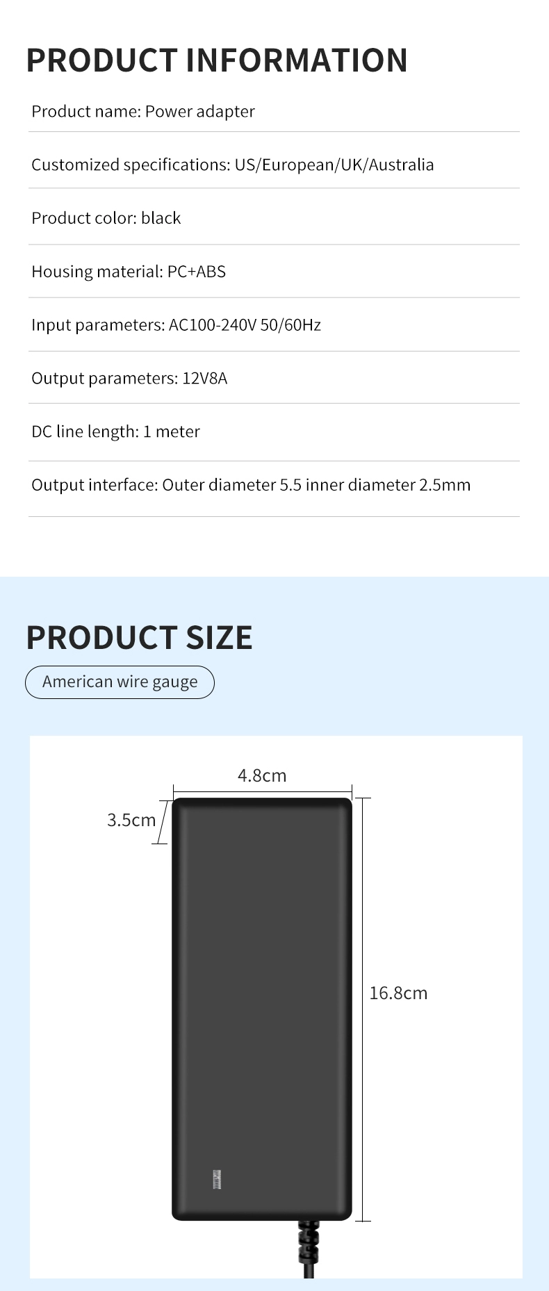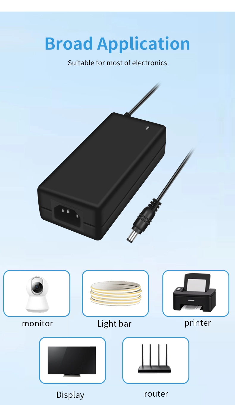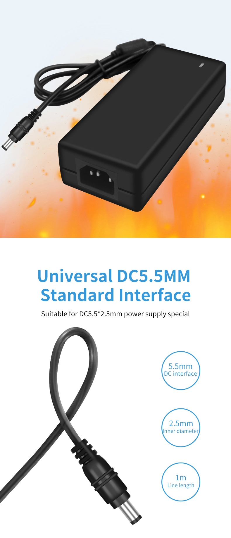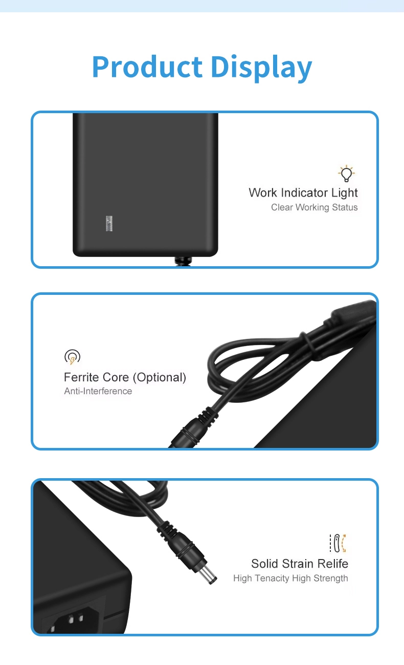 Input tegangan lebar AC 100-240V kompatibel dengan jaringan listrik di lebih dari 100 negara di seluruh dunia. Kabel output yang diperluas sepanjang 1,5m (diameter 1,0mm²) dipasangkan dengan konektor DC yang dapat diputar 180° beradaptasi dengan berbagai skenario pemasangan. Dengan ukuran ringkas hanya 120×60×30mm, adaptor ini 35% lebih kecil dibandingkan adaptor tradisional dengan daya yang sama, dan berbobot hanya 280g—meningkatkan portabilitas sebesar 50%.