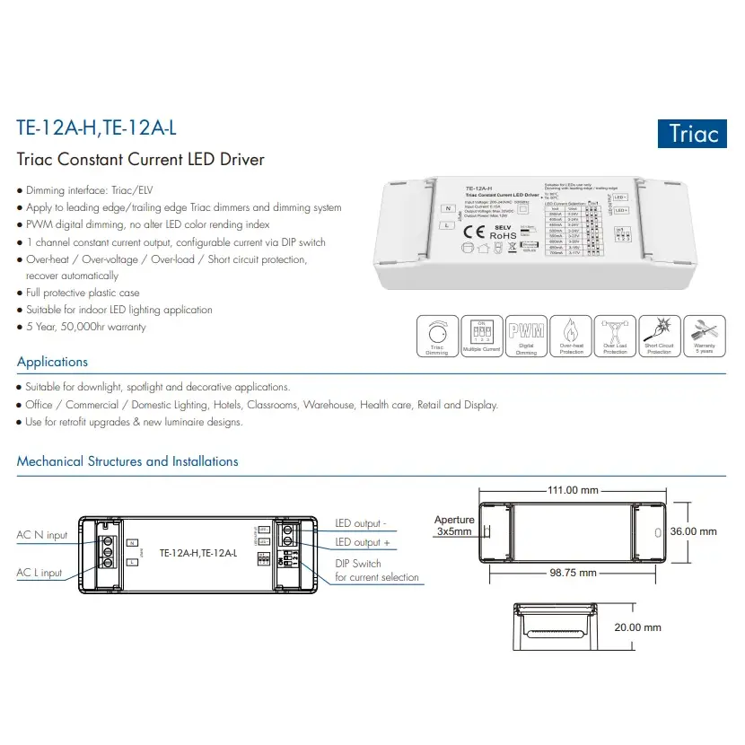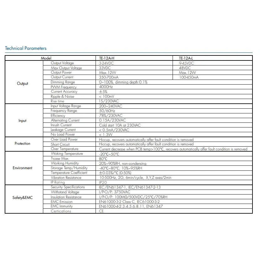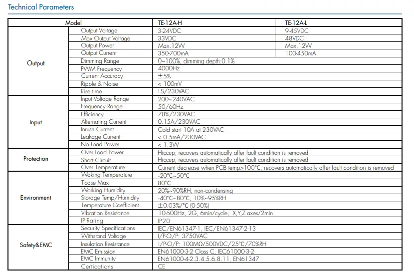 Tegangan masuk: 200-240VAC 50-60Hz Arus masukan: 0,15A Daya Keluaran: Maks. 12 Watt Tegangan keluaran: 9~42V Garansi: 2 tahun Sertifikat:CE/Rohs