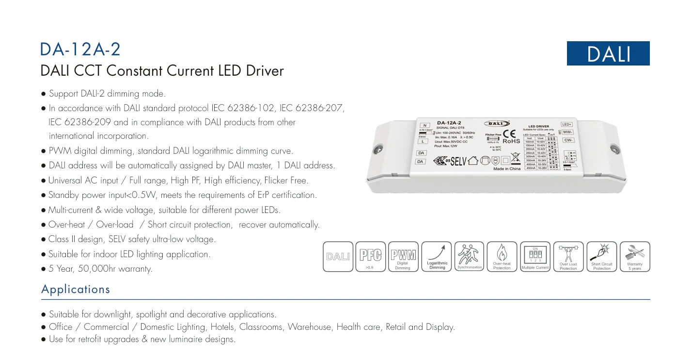 Bertempat di wadah IP20 yang ringkas, Driver LED yang Dapat Dimmable ini menyederhanakan pemasangan bahkan di ruang terbatas seperti profil LED atau rumah perlengkapan. Dengan menggabungkan keluaran Arus Konstan, penyetelan CCT yang luas, dan kompatibilitas DALI-2 standar industri, produk ini berfungsi sebagai driver yang ideal dan tahan masa depan untuk lampu downlight putih merdu, perlengkapan linier, dan pencahayaan arsitektural—terintegrasi secara mulus ke dalam ekosistem pencahayaan cerdas modern sebagai Driver LED DALI CCT Dimmable Arus Konstan yang serbaguna.