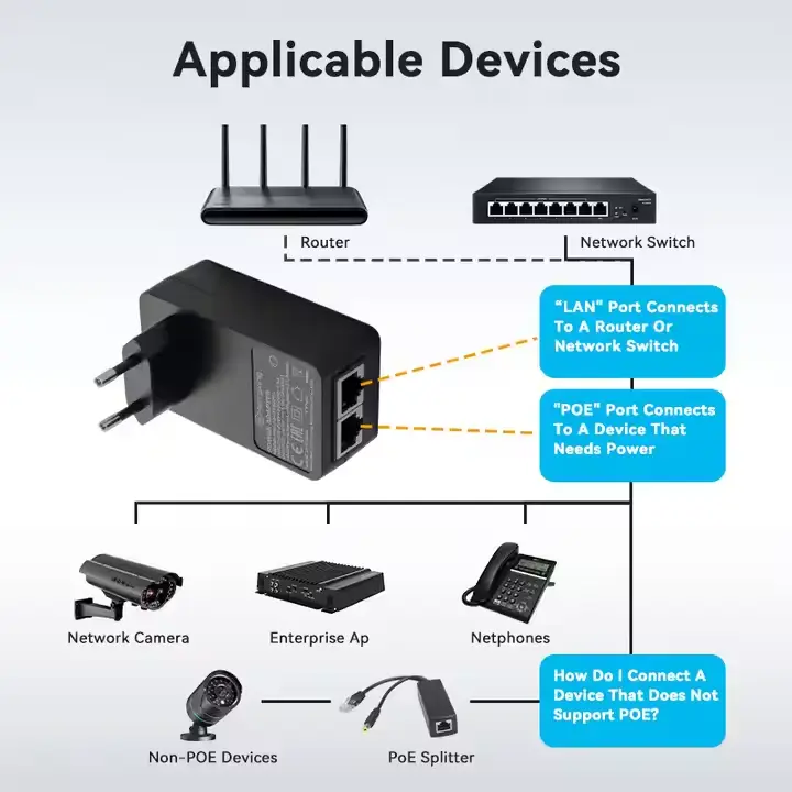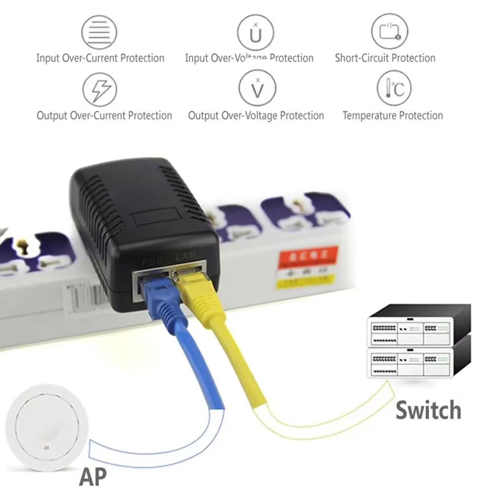 Sempurna untuk memberi daya pada titik akses nirkabel (AP) di kantor, hotel, dan rumah di mana pemasangan di dinding menghemat ruang.