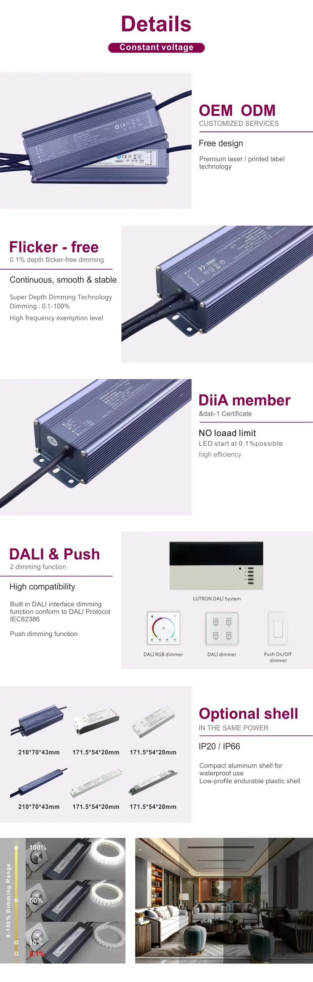 Rasakan stabilitas cahaya mutlak dengan jaminan keluaran bebas kedip, penting untuk kantor, toko ritel, dan fasilitas kesehatan. Ciptakan suasana tak tertandingi dengan rentang peredupan 0,1% hingga 100% yang sangat halus, memungkinkan transisi mulus dari pencahayaan tugas yang terang ke cahaya atmosfer yang halus.