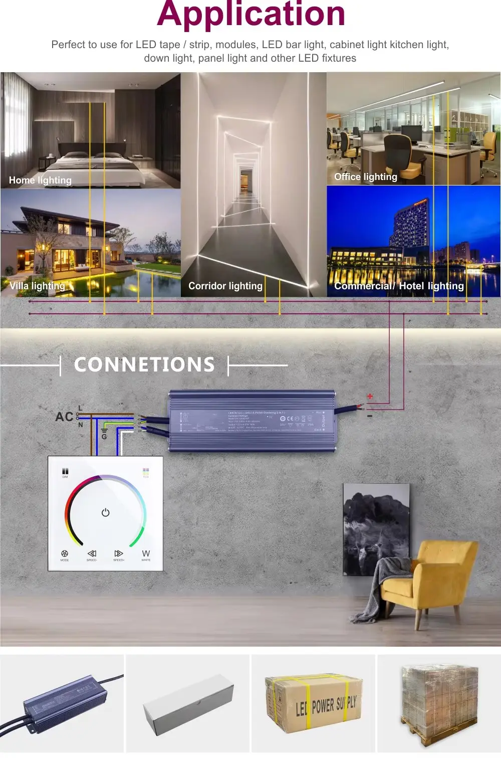 Tersedia dari 10W hingga 360W, driver tegangan konstan ini secara andal memberi daya pada lampu strip LED, modul, dan perlengkapan linier dalam jangka panjang. Ini adalah pilihan ideal untuk: