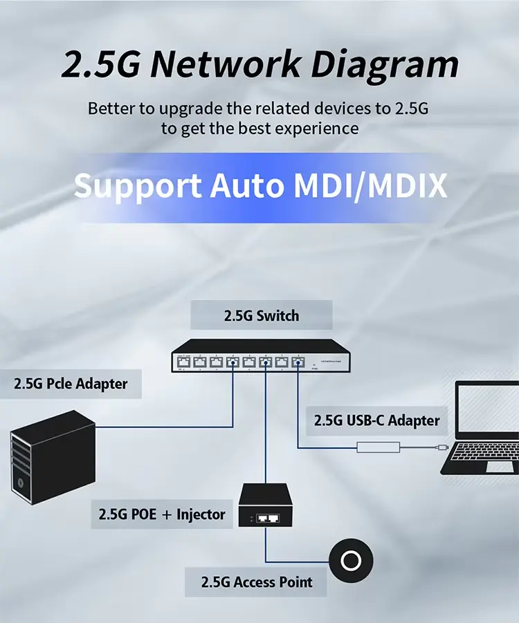 Tetap terdepan dalam kurva bandwidth dengan dukungan kecepatan data 2,5Gbps, kompatibel sepenuhnya dengan perangkat 10/100/1000Mbps.