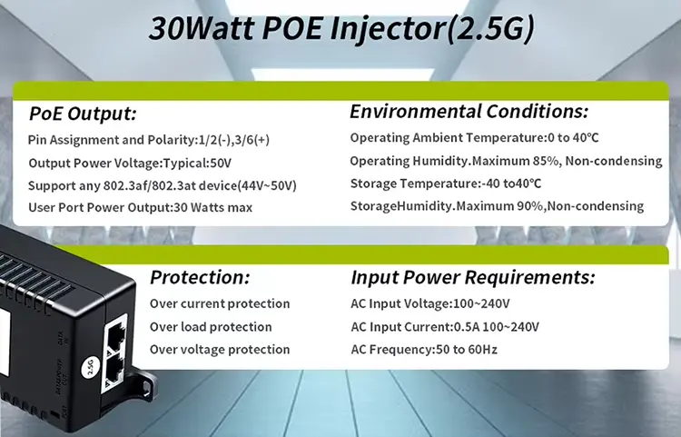 Injektor Poe 30W ini mendukung berbagai standar PoE, menjadikannya pilihan fleksibel untuk berbagai perangkat.