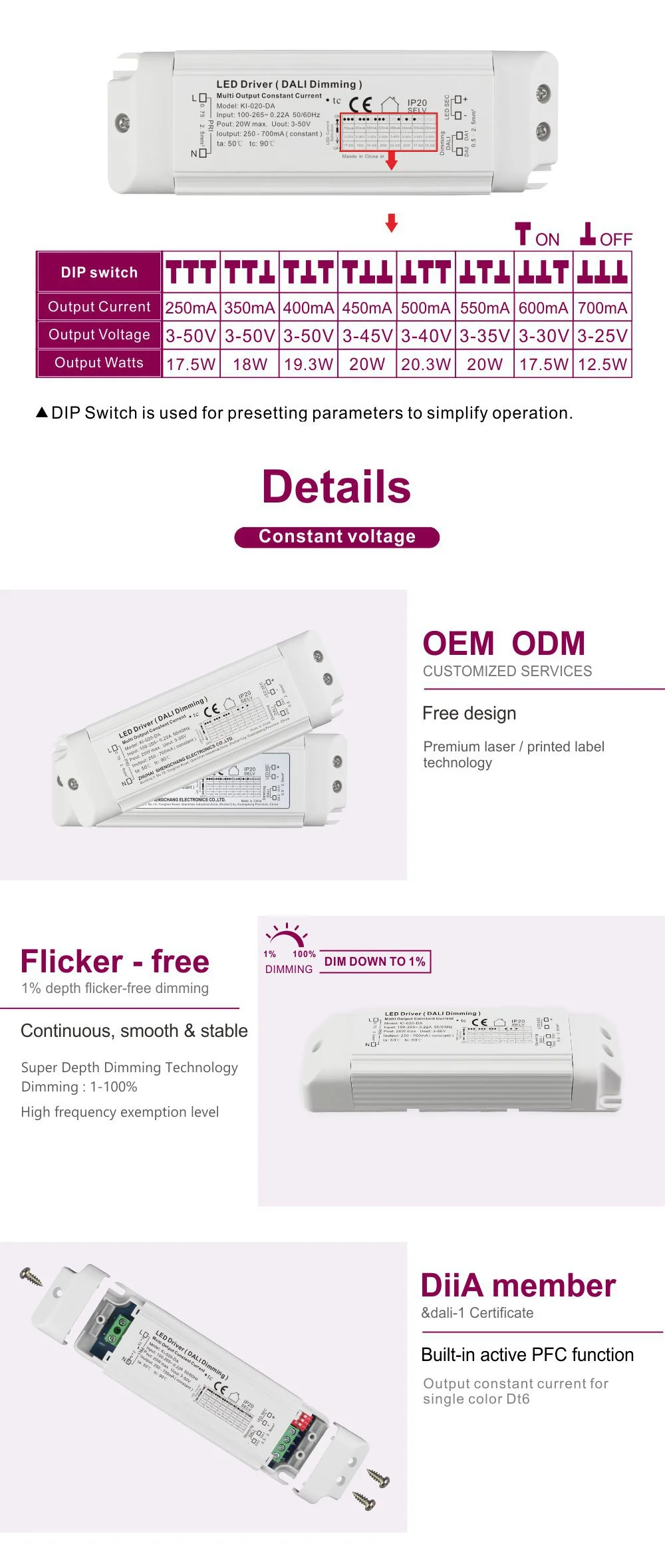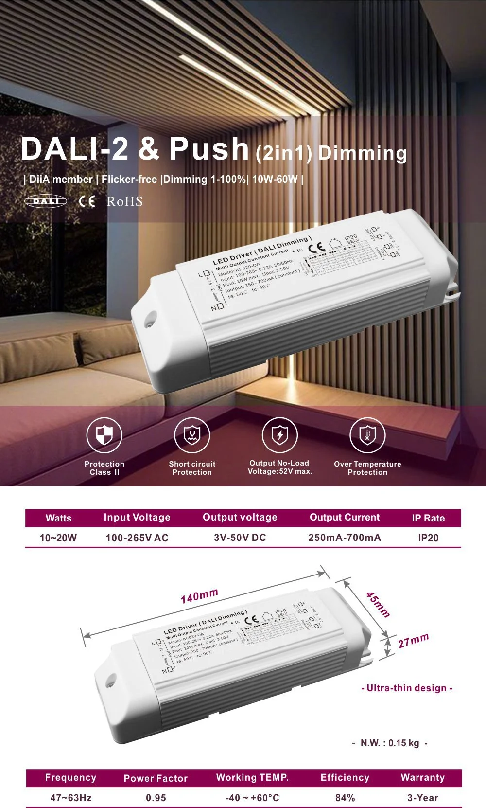 Kesimpulannya, ini adalah driver LED peredupan DALI arus konstan 20W dengan fungsi komprehensif dan kinerja yang andal. Apakah Anda perlu membangun jaringan pencahayaan cerdas DALI yang kompleks atau mencari driver yang dapat diredupkan yang stabil dan mudah digunakan, driver LED arus konstan peredupan DALI 20W ini dapat menjadi pilihan luar biasa bagi Anda, memberikan daya yang cerdas, efisien, dan tahan lama untuk semua jenis lampu LED.