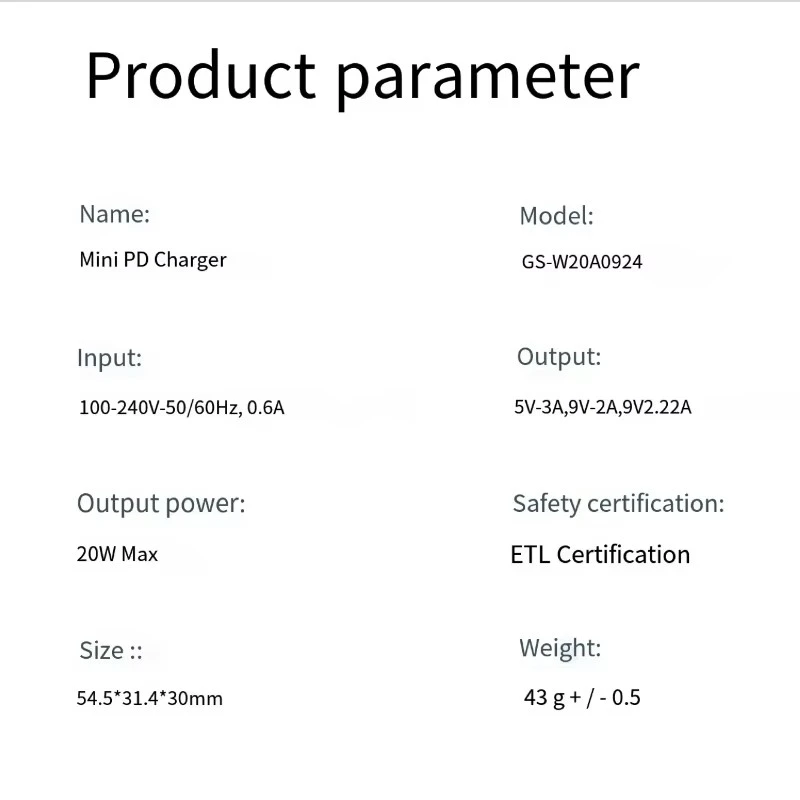 Spesifikasi Pengisi Daya PD colokan versi Jepang 20W: