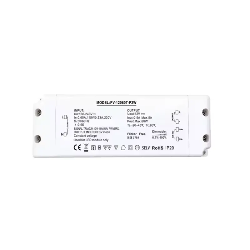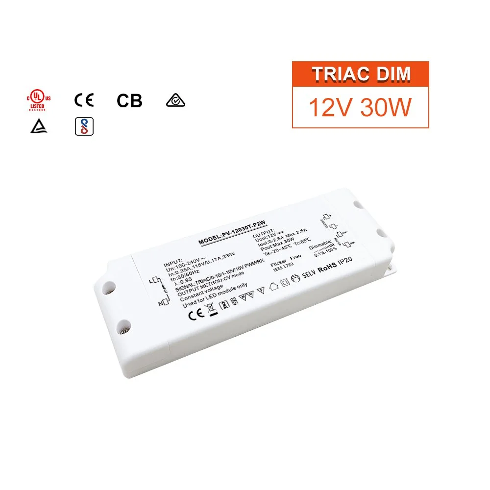 Sebagai driver led peredupan Triac Catu Daya Tegangan Konstan yang stabil, ia memberikan output tegangan 12V DC yang konstan. Catu daya triac 12V 30W yang dapat diredupkan ini mengadopsi komponen berkualitas tinggi dan desain sirkuit canggih, memastikan tegangan keluaran stabil di seluruh rentang peredupan penuh dan pada dasarnya menghilangkan kedipan lampu. Ini adalah driver led peredupan triac yang benar-benar bebas kedip untuk penggunaan di dalam ruangan. Fitur anti-kedipnya tidak hanya menciptakan lingkungan visual yang nyaman dan sehat namun juga secara efektif melindungi sumber dan modul cahaya LED yang sensitif, sehingga memperpanjang masa pakai perlengkapan pencahayaan secara keseluruhan.