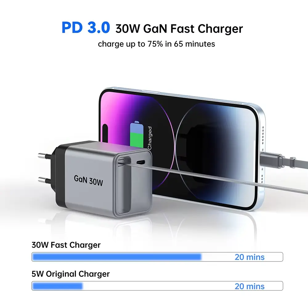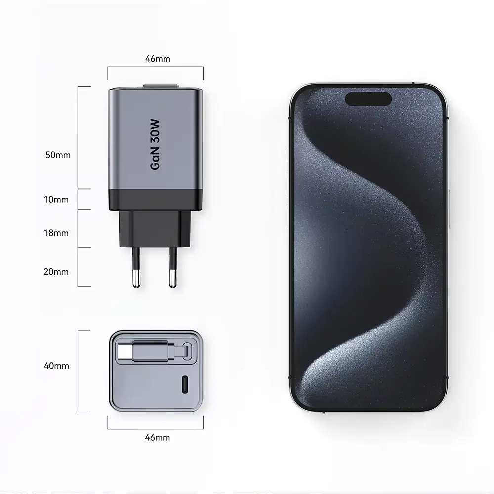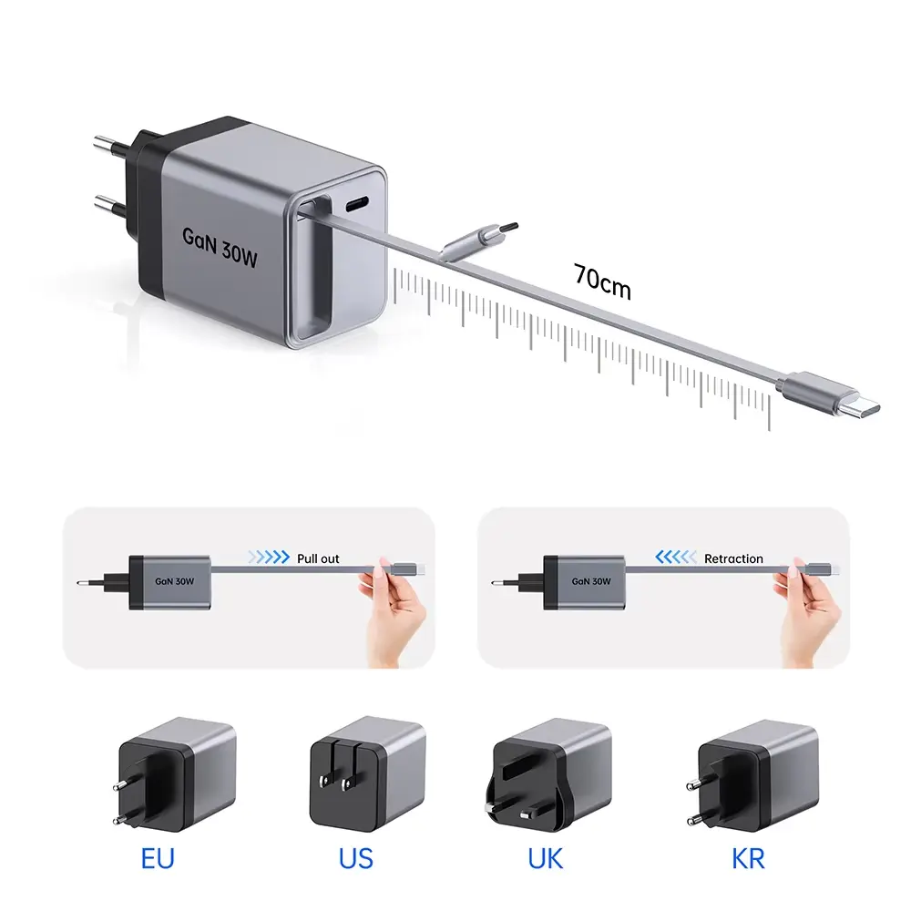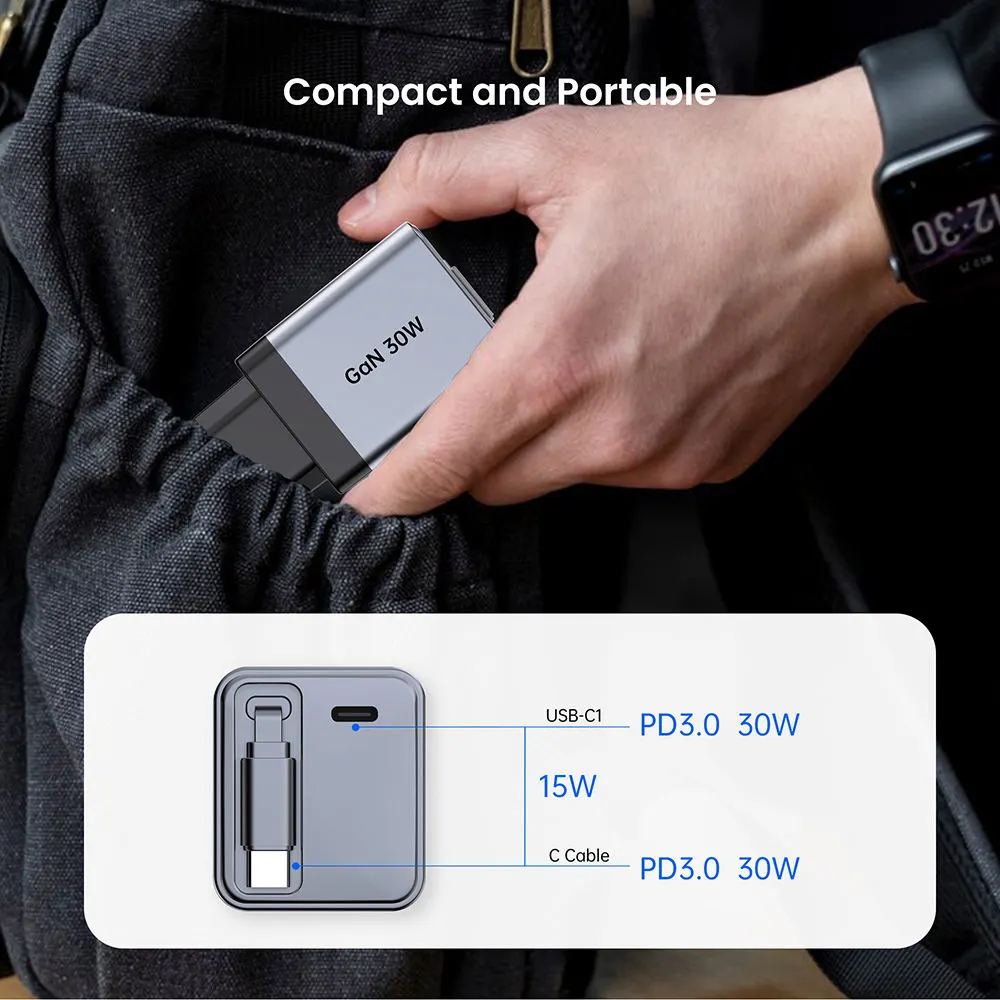 Pengisi Daya Cepat 30W dengan Kabel Tipe C yang Dapat Ditarik Desain ultra-ringan dan berukuran saku membuatnya mudah dibawa kemana-mana. Ini pilihan sempurna untuk rumah, kantor, atau perjalanan.