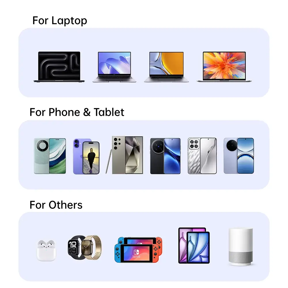 Kompatibel dengan perangkat USB-C, termasuk ponsel, headphone, dan aksesori game. Secara otomatis mendeteksi kebutuhan perangkat akan pengisian daya yang aman dan efisien. 4. Portabilitas Siap Perjalanan