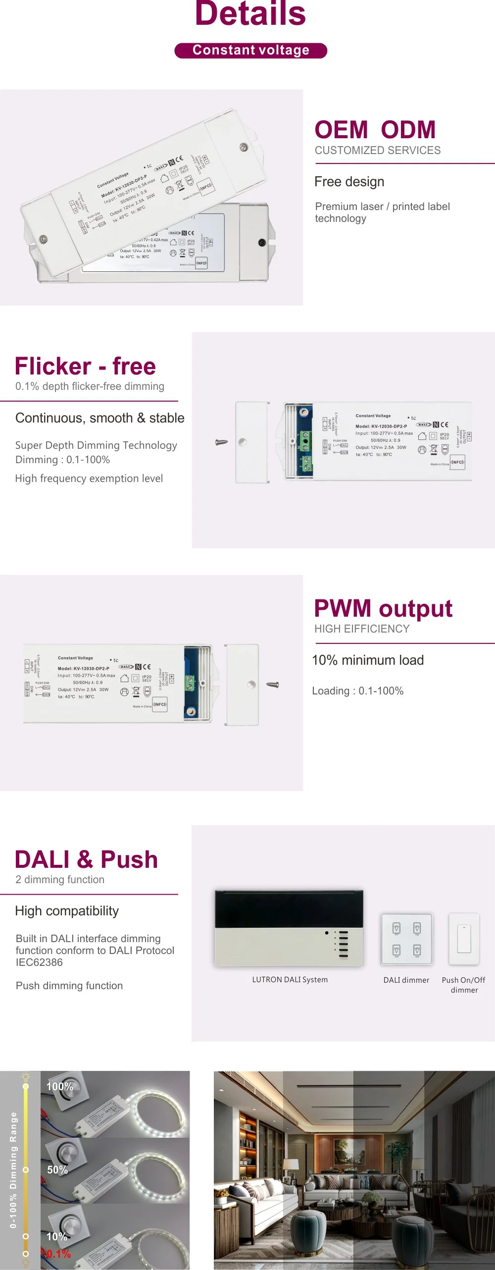 Driver LED DALI 30W tegangan konstan 30W yang dapat diredupkan, dengan keluaran tegangan konstan yang stabil, kemampuan kontrol yang kuat dari protokol DALI, efek cahaya bebas kedip berkualitas tinggi, kemampuan beradaptasi tegangan lebar, dan sertifikasi keselamatan yang andal, memberikan "jantung" yang kuat dan cerdas untuk berbagai aplikasi pencahayaan LED.