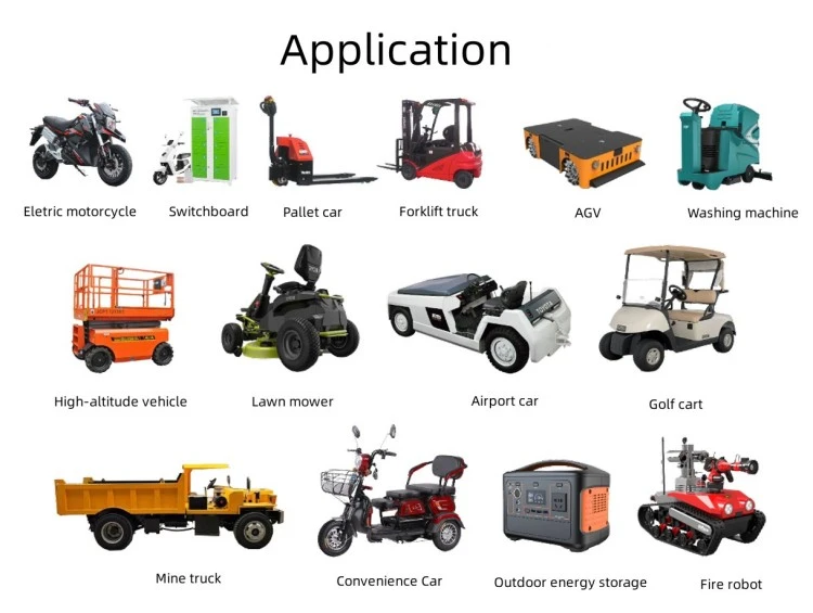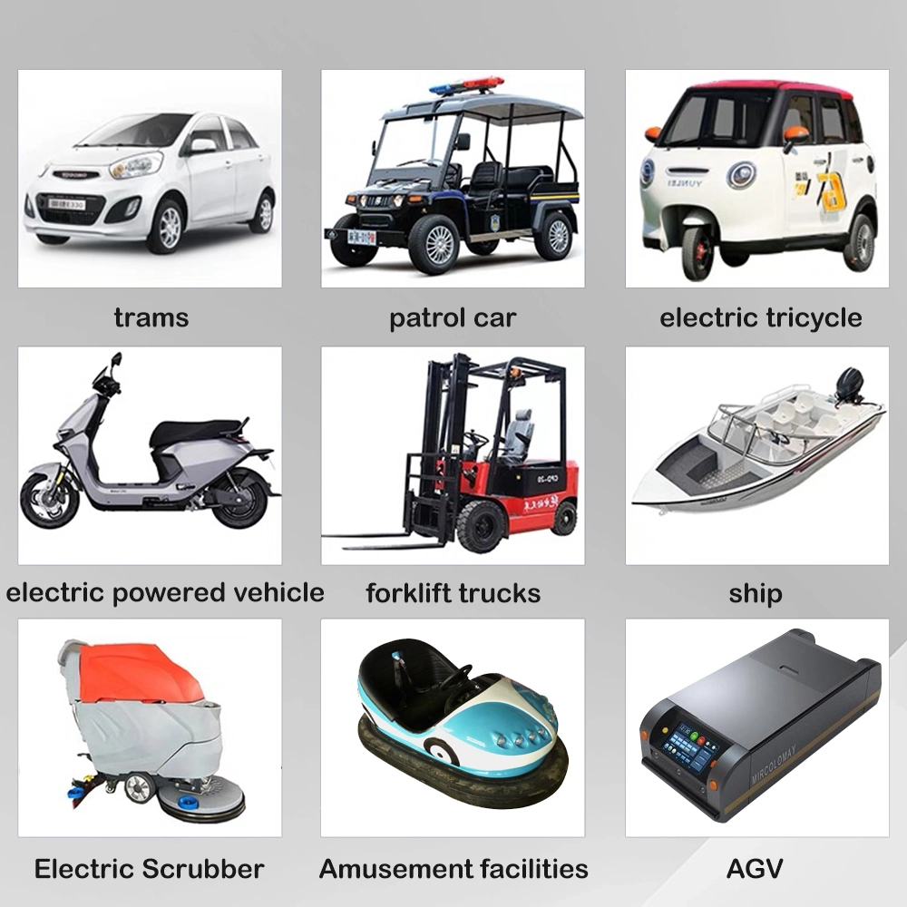 Aplikasi Produk Mobil bemper listrik dan wahana hiburan Kendaraan tamasya dan kereta golf Kendaraan patroli dan kereta keamanan Forklift dan peralatan penanganan material Scrubber lantai dan mesin pembersih Kendaraan berpemandu otomatis (AGV) untuk gudang Kapal listrik, perahu, dan kapal utilitas kelautan