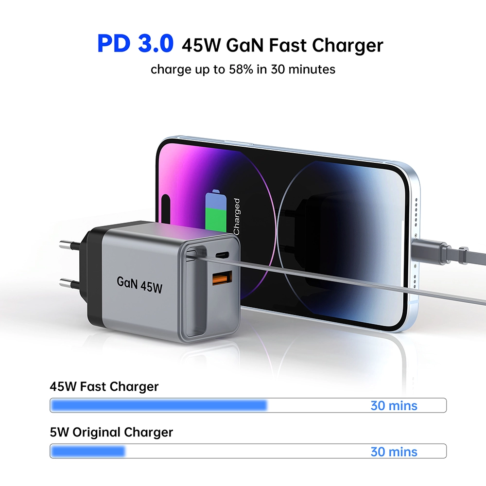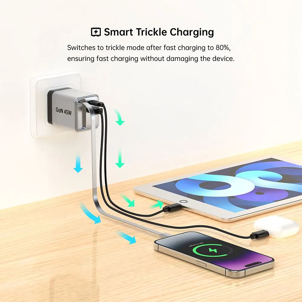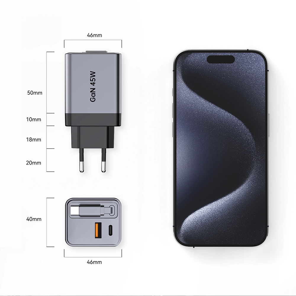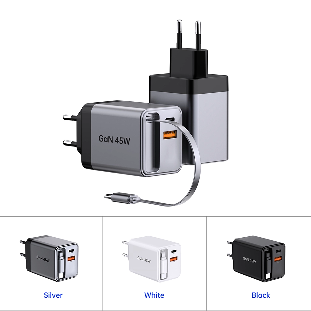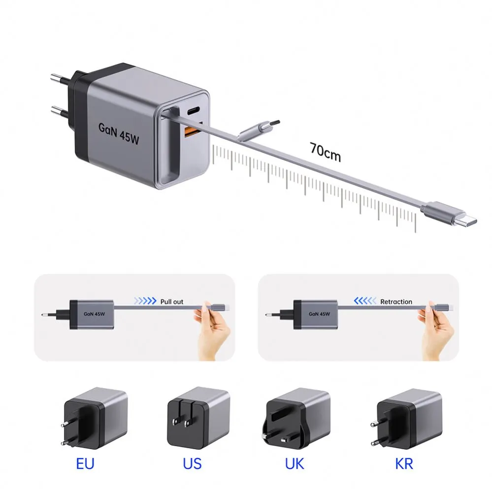 Pengisian Daya Berkecepatan Tinggi: Pengisi Daya Cepat yang Dapat Ditarik GAN 45W mengunggulkan output bertenaga sebesar 45 watt, memastikan pengisian daya yang cepat untuk perangkat Anda.