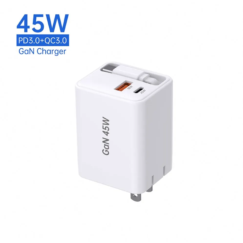 Pengisi Daya Cepat GAN 45W yang Dapat Ditarik USB-CABLE+USB-A+USB-C Pengisi Daya PD 45W dengan Kabel