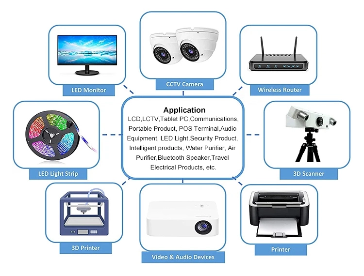 * Lebih banyak unit untuk seri 48W: tersedia 5V/9V/12V/15V/19V/24V/36V/48V * Keamanan: OCP/OVP/OTP, SCP, pemutusan beban berlebih otomatis, pemutusan tegangan berlebih, pemutusan termal otomatis. * Kompatibilitas luas: Lampu Strip LED, Printer 3D, transceiver radio ham, kamera CCTV, amp subwoofer mobil, penguat audio, router nirkabel, Kucing ADSL, Pelembap Udara, HUB, Keyboard, Speaker BT, Monitor, Webcam, DVR, NVR, catu daya audio/video