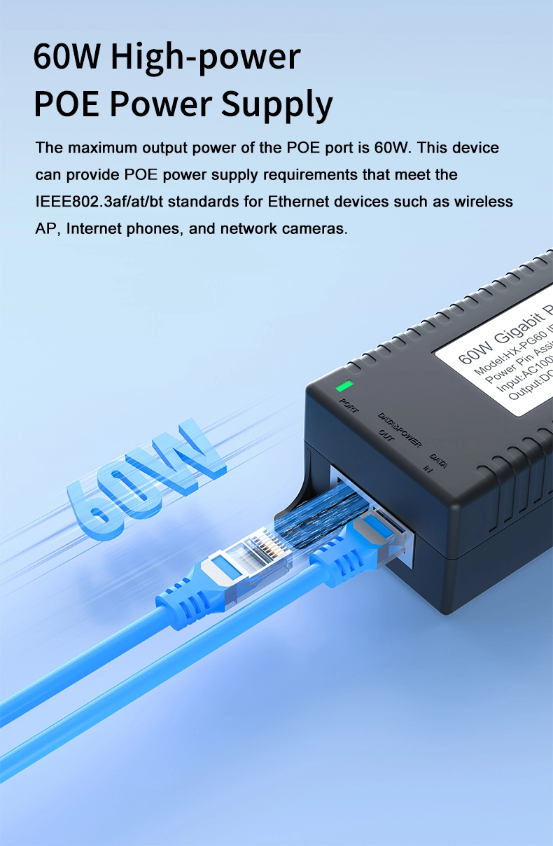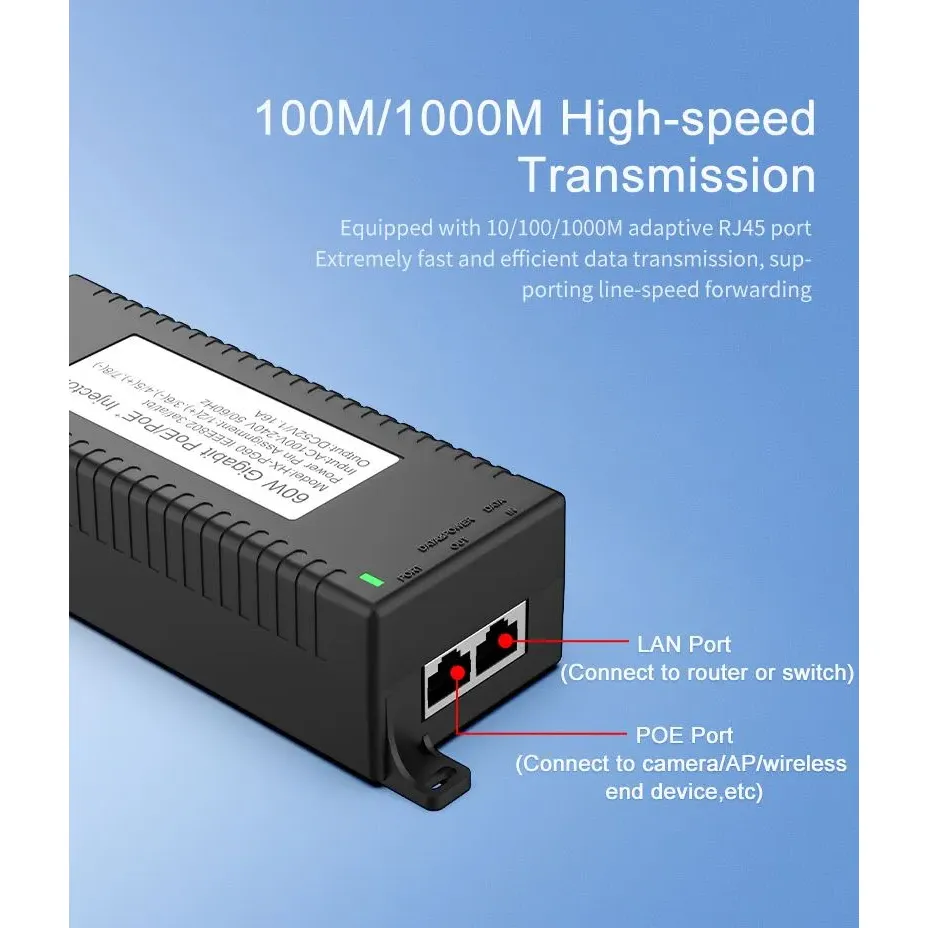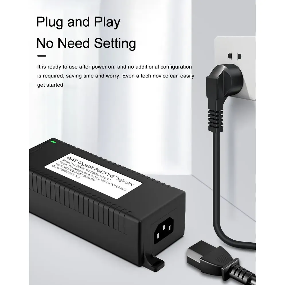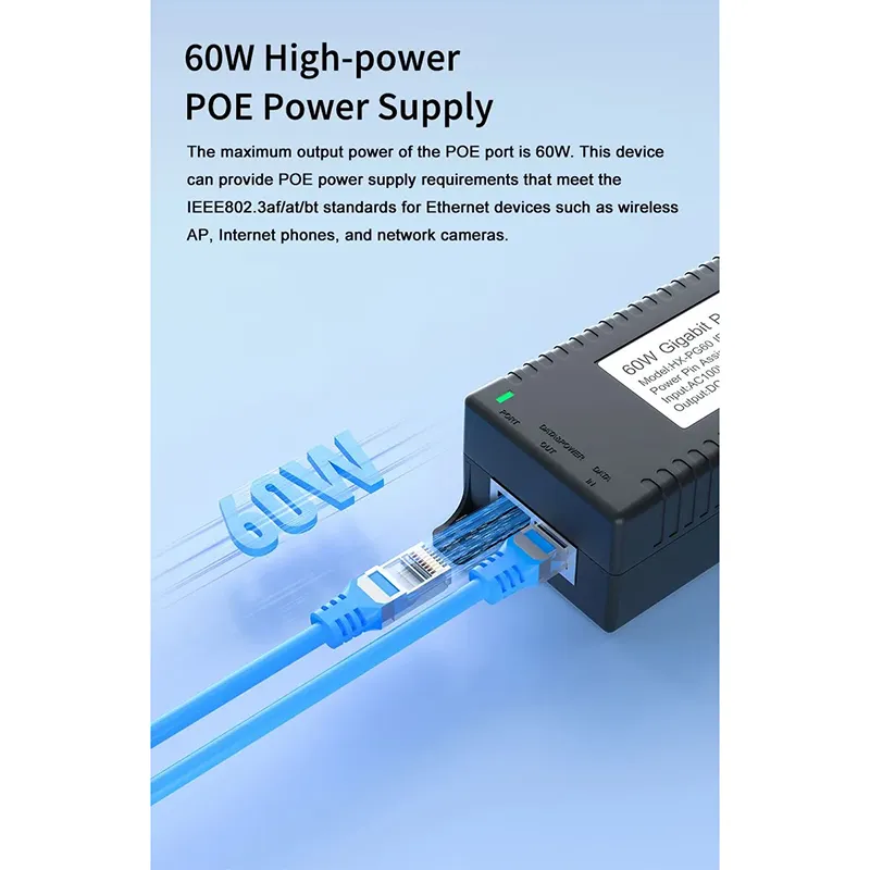 Pengawasan Keamanan: Injektor POE desktop Gigabit 60W untuk Keamanan Kamera IP dan Perangkat Jaringan memberikan daya yang stabil ke kamera IP dan kamera PTZ.