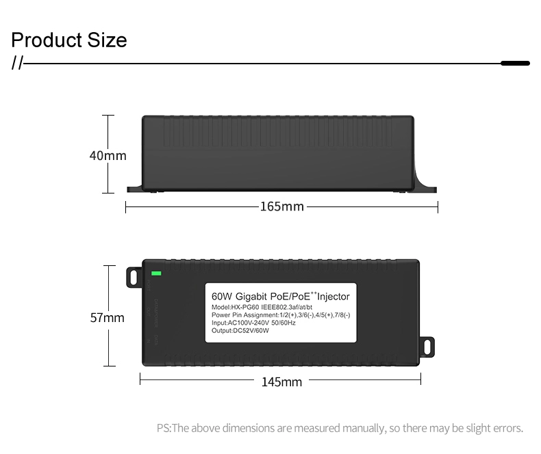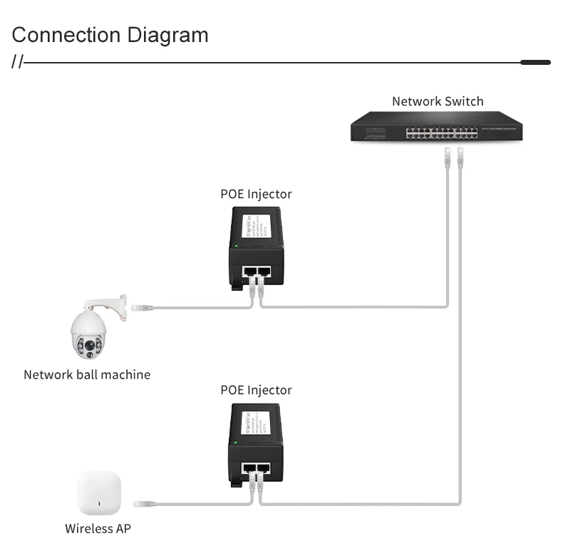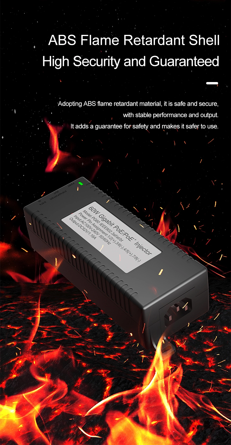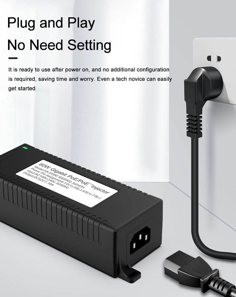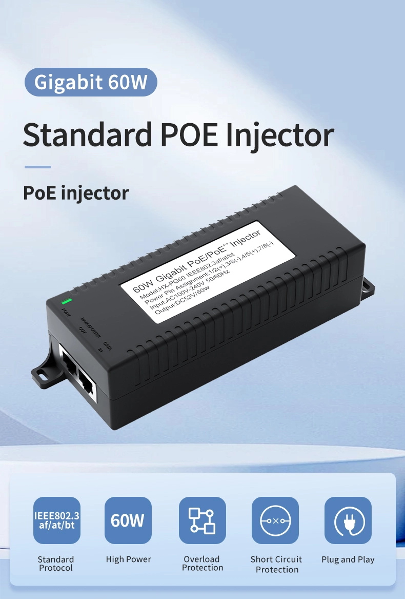 Pengawasan Keamanan: Injektor POE desktop Gigabit 60W untuk Keamanan Kamera IP dan Perangkat Jaringan memberikan daya yang stabil ke kamera IP dan kamera PTZ.