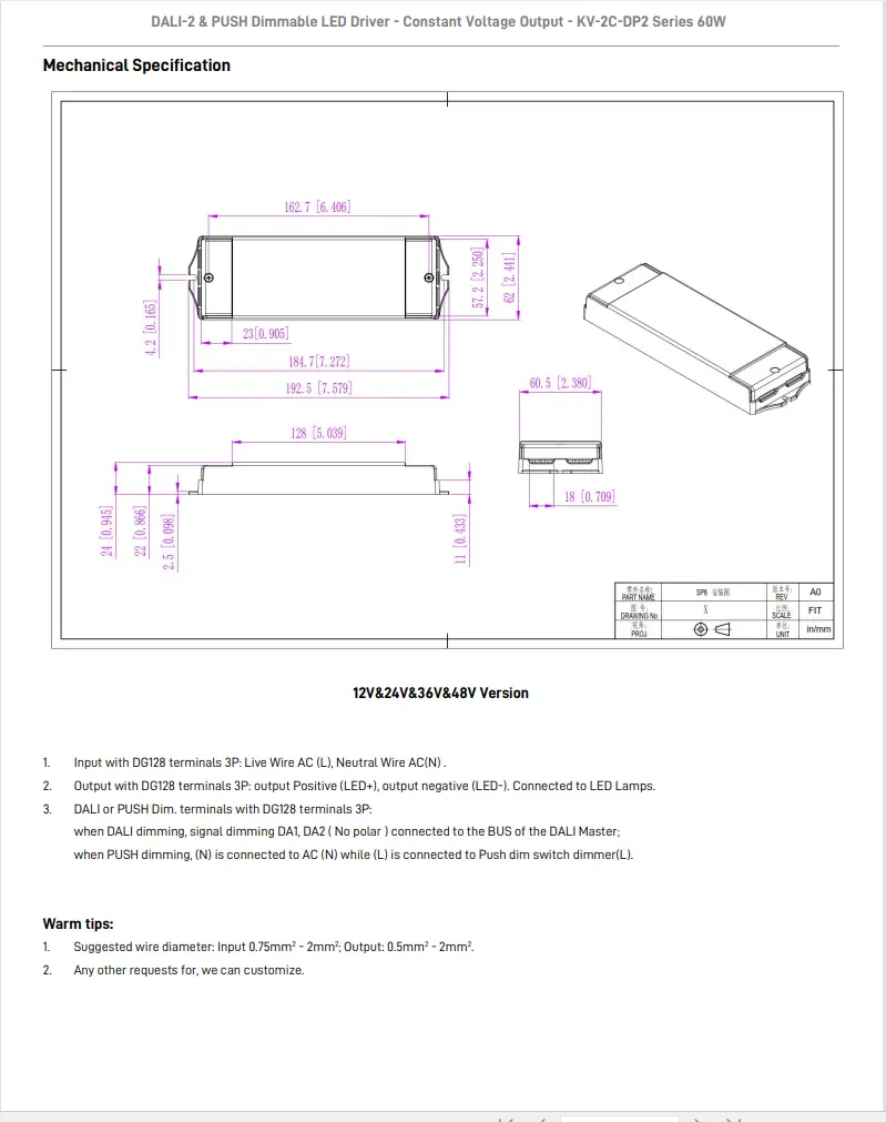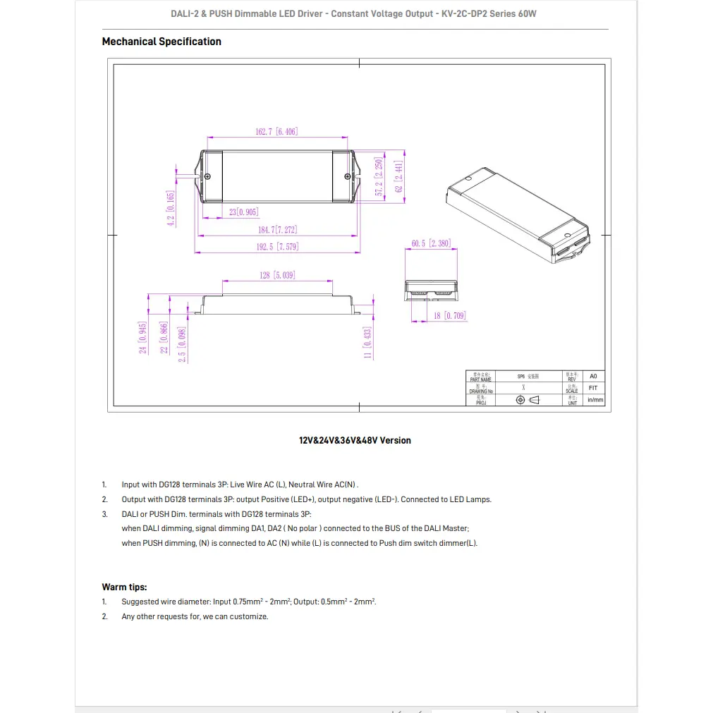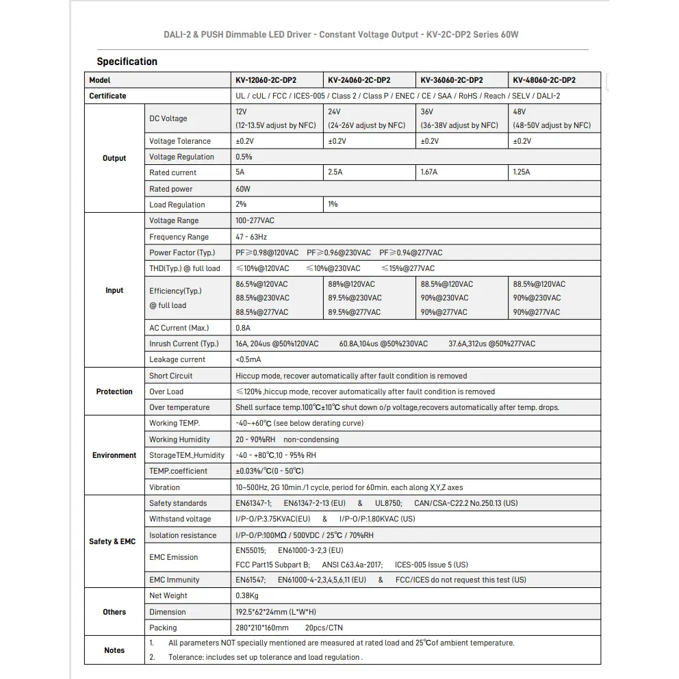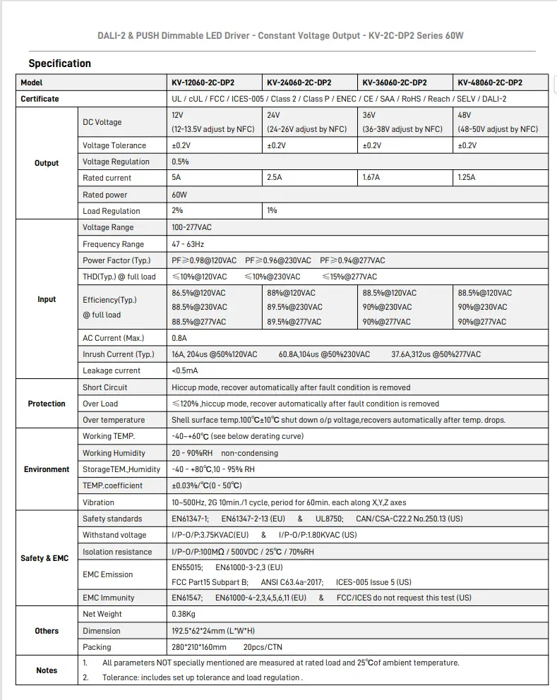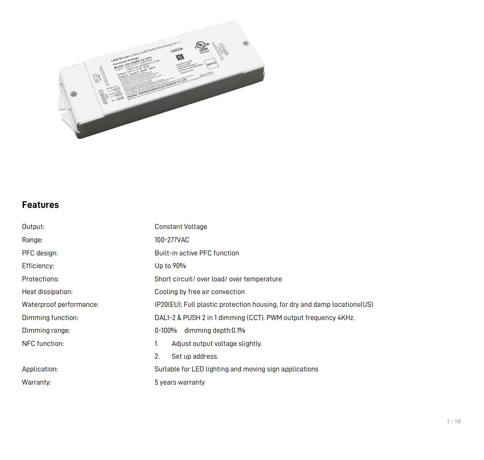 Fungsi peredupan: peredupan DALI-2 & PUSH 2 in 1 (CCT). Frekuensi keluaran PWM 4KHz.