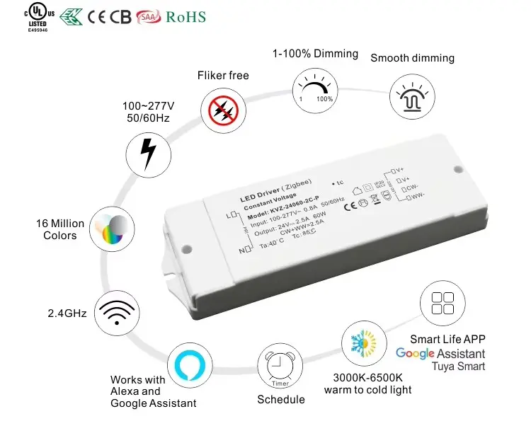 Instalasi Mudah, Performa Tahan Lama Didesain untuk kesederhanaan, Driver 60W led Zigbee 3.0 dilengkapi koneksi kabel langsung yang sederhana dan aman. Dengan peringkat IP20, cocok untuk lokasi kering dan lembap—dalam ruangan atau lingkungan terlindung. Didukung oleh garansi 5 tahun, ia menawarkan ketenangan pikiran jangka panjang.