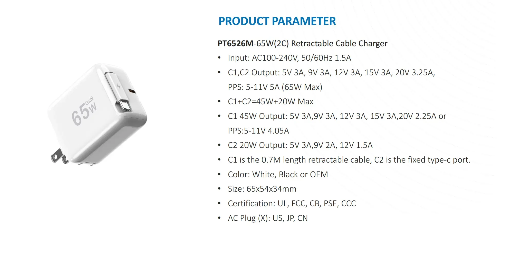 Pengisi Daya PD 65W dengan Kabel usb c yang dapat diatur Spesifikasi: