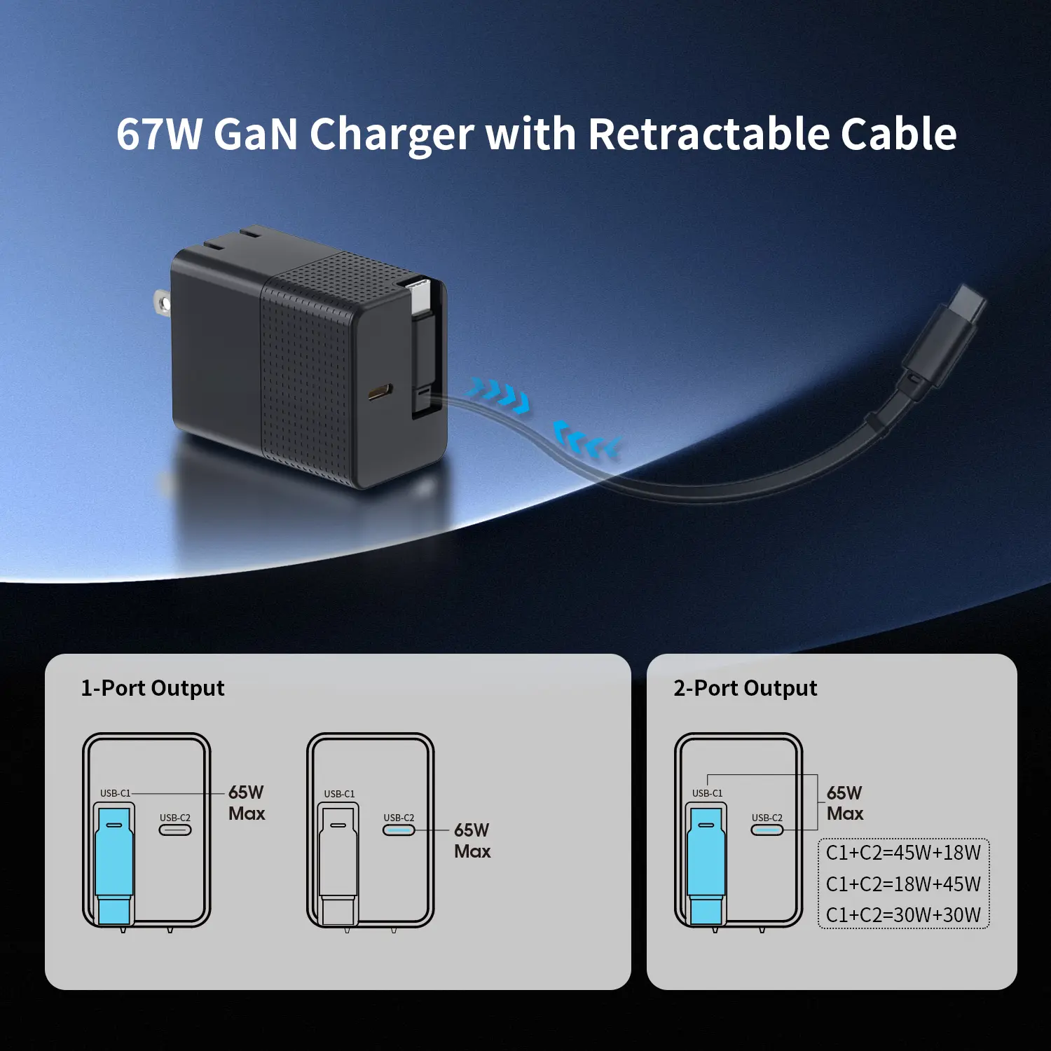 Dilengkapi dengan Kabel yang Dapat Ditarik: Adaptor Pengisian Cepat 65W dilengkapi dengan kabel data USB-C sepanjang 2,3 kaki (1 meter) yang nyaman dan tidak kusut. Kabel ini dapat memanjang dan menarik kembali dengan lancar, sehingga menghindari kekacauan kabel yang kusut dan memastikan Anda dapat mengisi daya kapan saja.