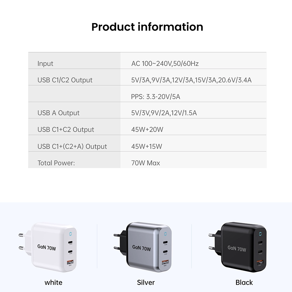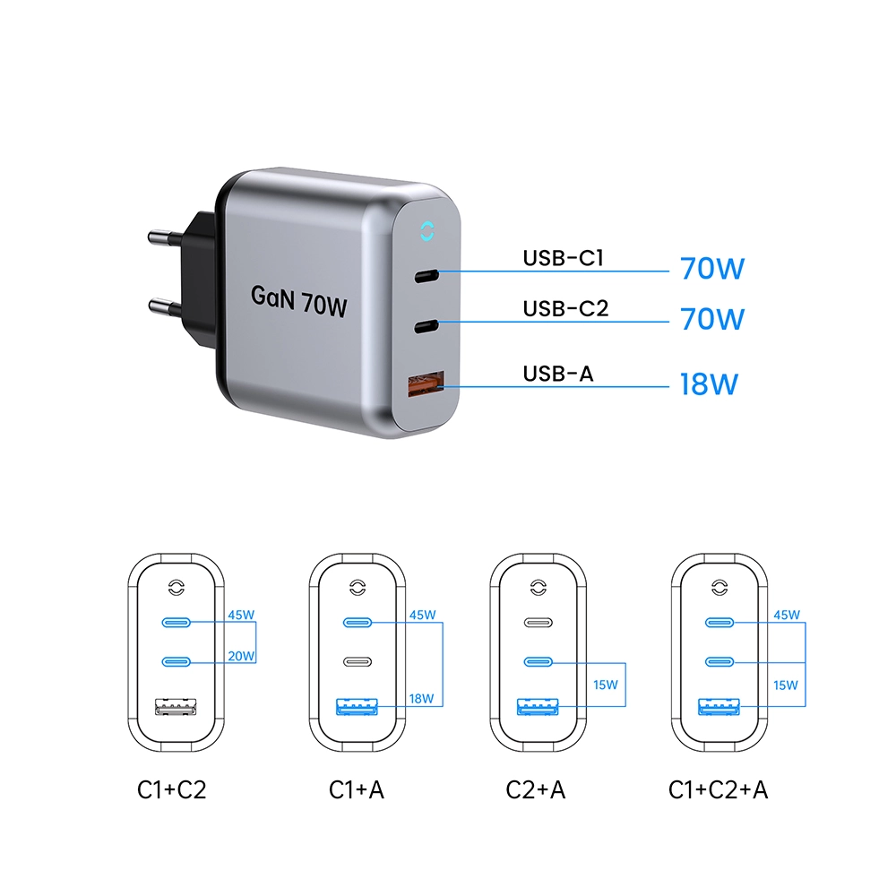 Keluaran C1/C2: 5V3A,9V3A,12V3A,15V3A,20.6V3.4A (Maks 70W) PPS: 3.3-11V 4.05A Keluaran USB-A: 5V3A,9V2A,12V1,5A 3.3-11V 2A(Maks 22W) Keluaran C1+C2: 45W+20W Keluaran C1+C2+USB-A: 45W+5V3A Jumlah:70W |