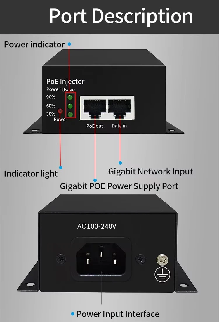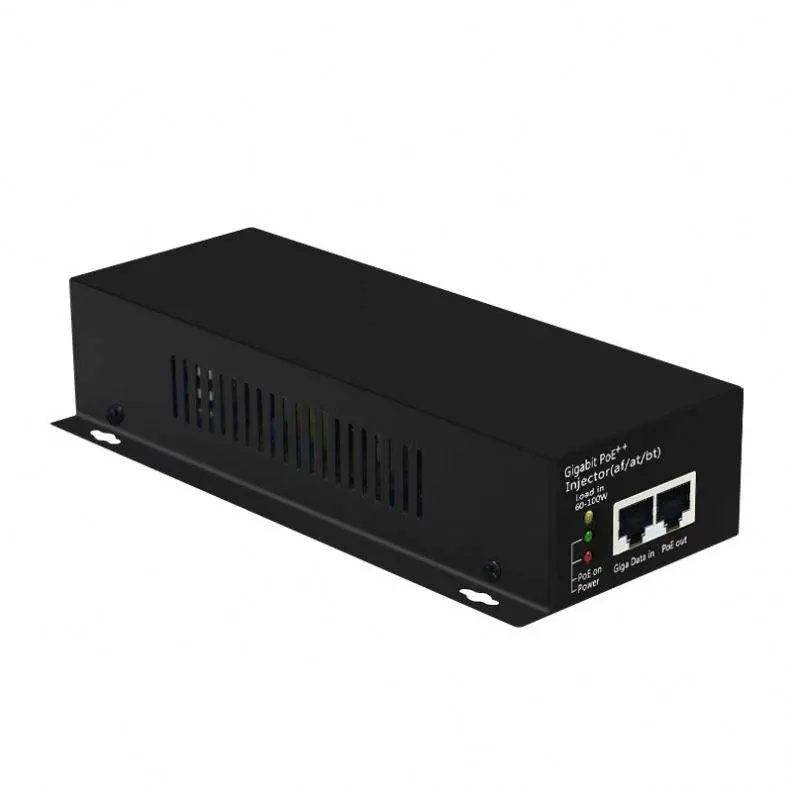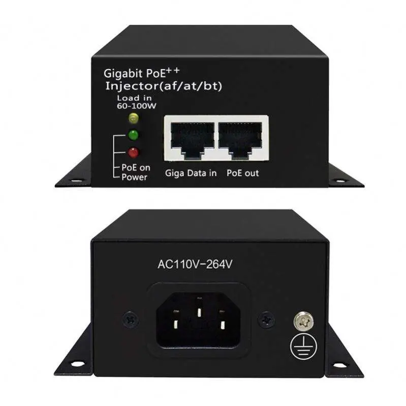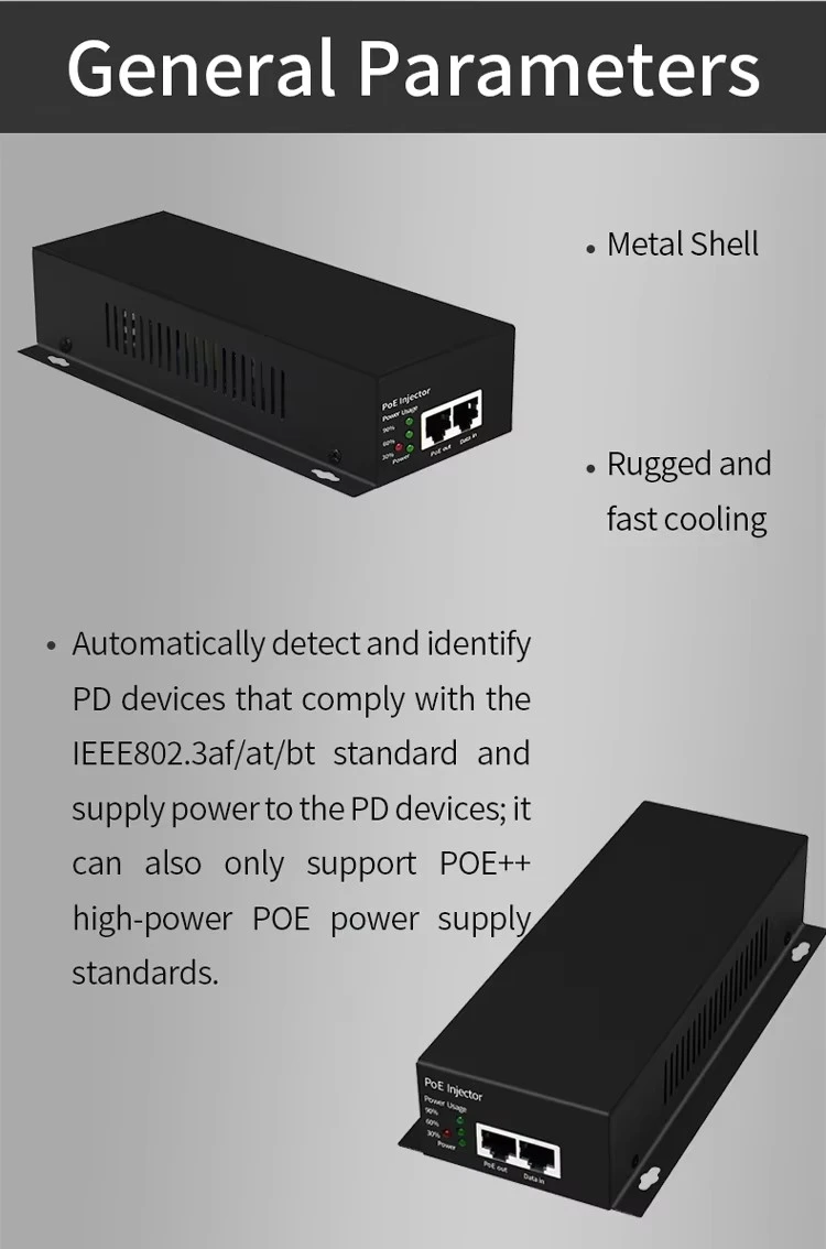 Injektor POE 60W Aktif berkualitas tinggi ditawarkan oleh pabrikan Cina Starwell. Perangkat ini dilengkapi satu port input data 10/100/1000Mbps dan satu port output PoE (Data+Daya). Ini sepenuhnya mendukung persyaratan polaritas alternatif 802.3bt, memanfaatkan keempat pasangan (1/2+,3/6- & 4/5+,7/8-) untuk transmisi data simultan dan catu daya 48V DC.