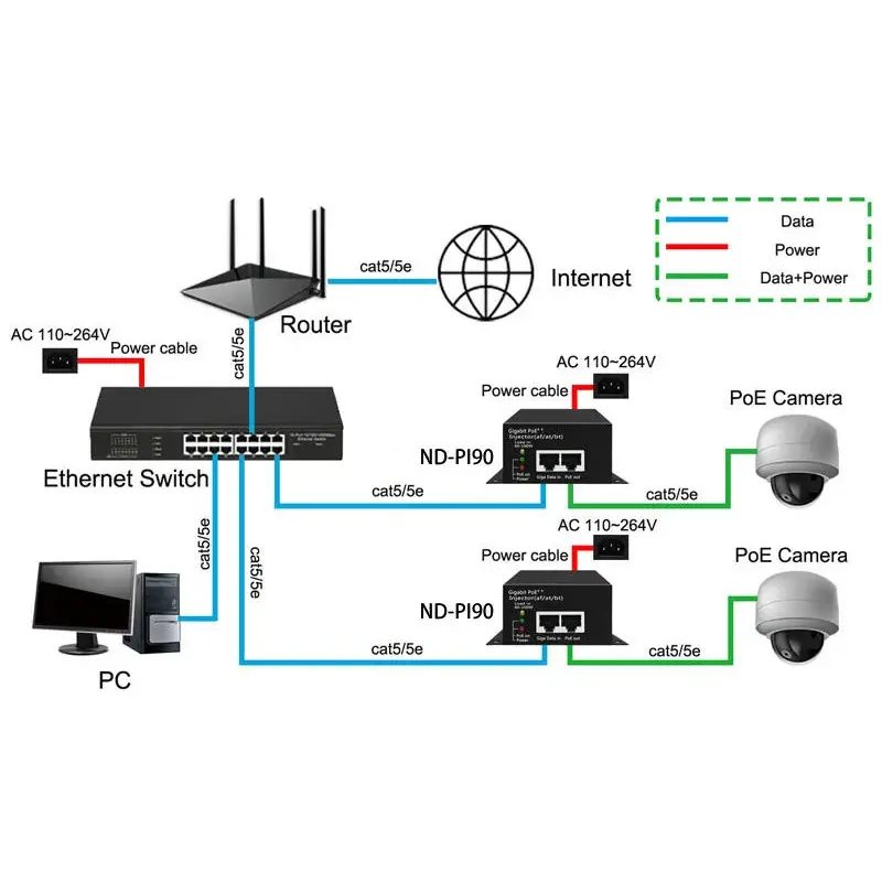 Transmisi Data Berkecepatan Tinggi Dilengkapi dengan satu port Gigabit PoE dan satu port uplink Gigabit RJ45, injektor POE 48V Aktif ini mendukung transmisi data 1000Mbps melalui kabel Cat5e, Cat6, atau lebih tinggi. Ini menggunakan keempat pasangan terpilin (1/2,3/6,4/5,7/8) untuk pengiriman daya dan data secara simultan, memastikan konektivitas tanpa batas dan integritas sinyal untuk aplikasi intensif bandwidth.