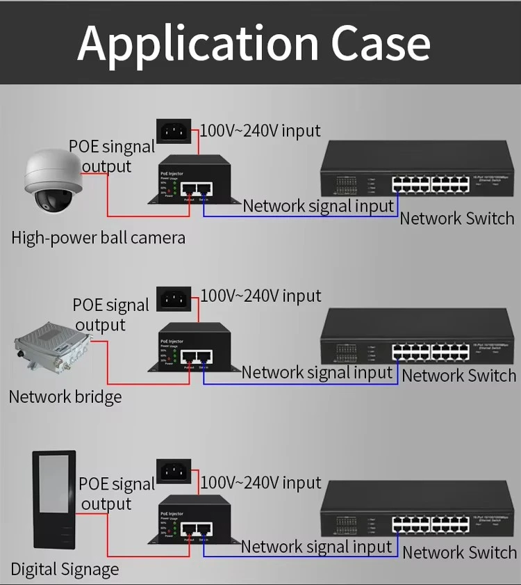 Dirancang untuk keserbagunaan, injektor ini kompatibel dengan perangkat 802.3af/at. Ini ideal untuk memberi daya pada kamera PTZ, titik akses nirkabel berkinerja tinggi, dan peralatan konferensi video. Produk ini menyediakan solusi plug-and-play yang sederhana, sehingga menghilangkan kebutuhan akan outlet listrik tambahan dan mengurangi kompleksitas instalasi dalam aplikasi perusahaan dan industri.