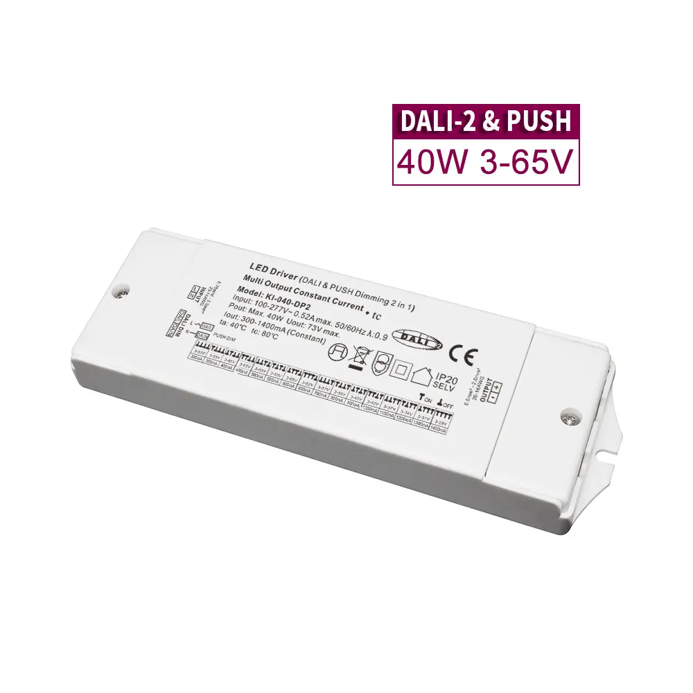 Pengemudi kami unggul dalam fleksibilitas kontrol. Ini terintegrasi secara mulus ke dalam ekosistem DALI-2 mana pun (protokol IEC 62386), memungkinkan peredupan, pengelompokan, dan pengaturan pemandangan tingkat lanjut untuk manajemen gedung cerdas. Untuk pengaturan yang lebih sederhana, fungsi peredupan PUSH terintegrasi menawarkan opsi kontrol manual yang nyaman. Pilih antara logaritmik (default) untuk peredupan sempurna yang berpusat pada manusia atau kurva linier untuk memenuhi kebutuhan aplikasi spesifik. Kombinasi ini memastikan kompatibilitas yang kuat dan peredupan yang sangat mulus dan bebas kedipan dari 100% hingga tingkat terendah.