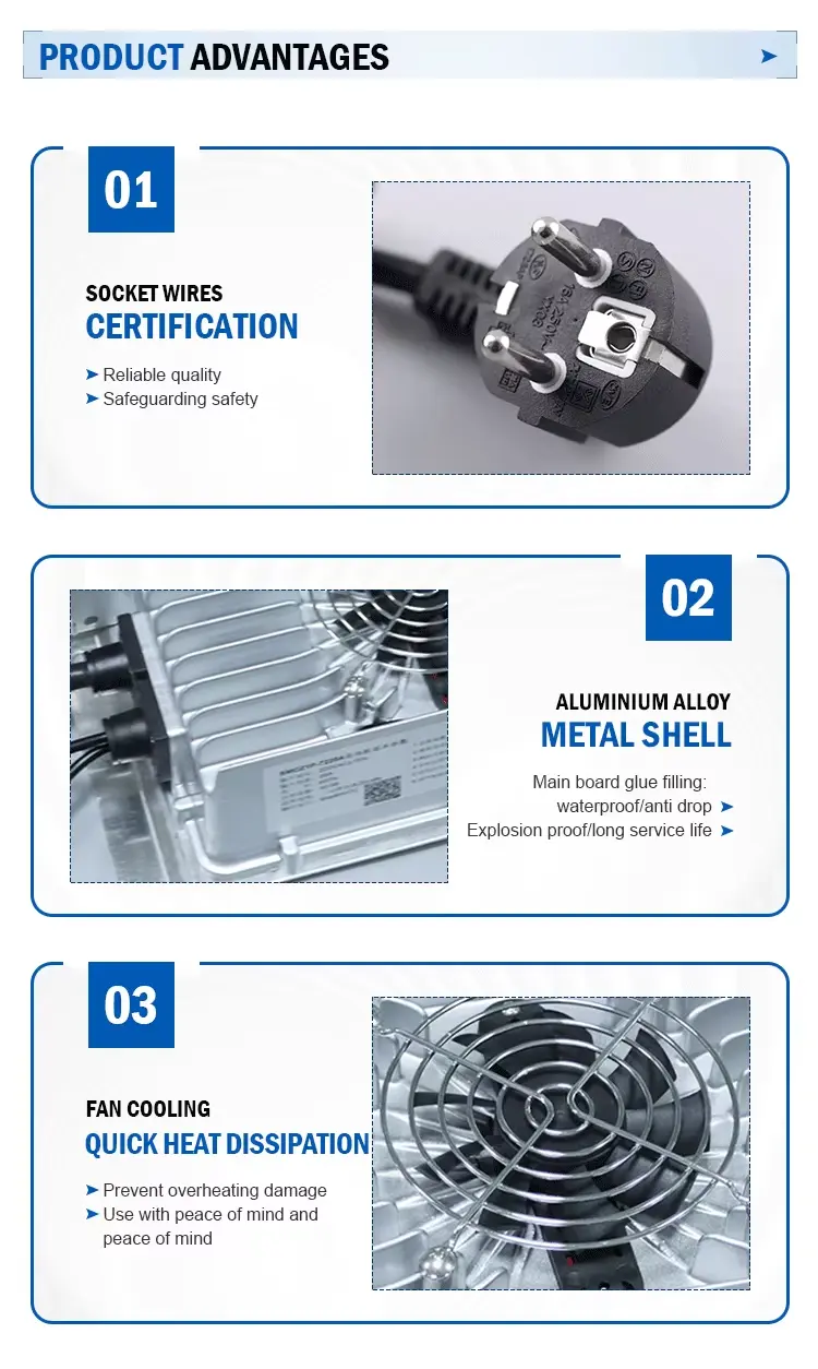 Efisiensi Tinggi & Perlindungan Cerdas: Mencapai efisiensi hingga 93% dan faktor daya ≥0,98, pengisi daya ini meminimalkan kehilangan energi dan mengurangi biaya pengoperasian. Perlindungan internal mencakup perlindungan tegangan berlebih, korsleting, polaritas terbalik, dan suhu berlebih. Indikator LED memberikan status pengisian daya yang jelas dalam sekejap.