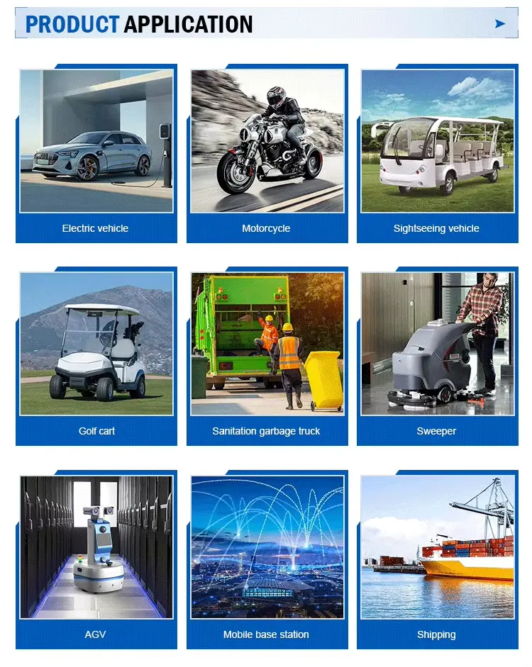 Penggunaan: Sepeda Motor / Skuter, Roda Tiga, Cropper, Sweeper, Forklift, Truk, Bus Listrik, Baterai Timbal-asam, Kendaraan listrik, Kendaraan tamasya, Kendaraan logistik, Kendaraan pembersih, Mobil patroli, Kereta bukit pasir, Kapal, Peralatan komunikasi