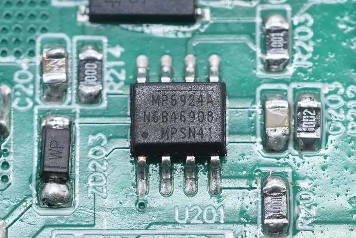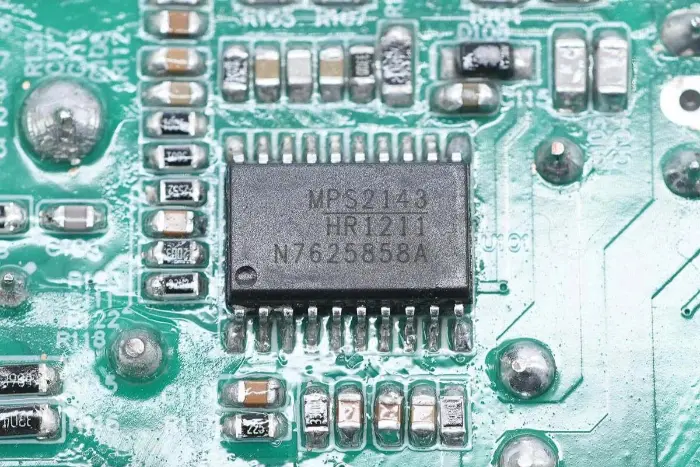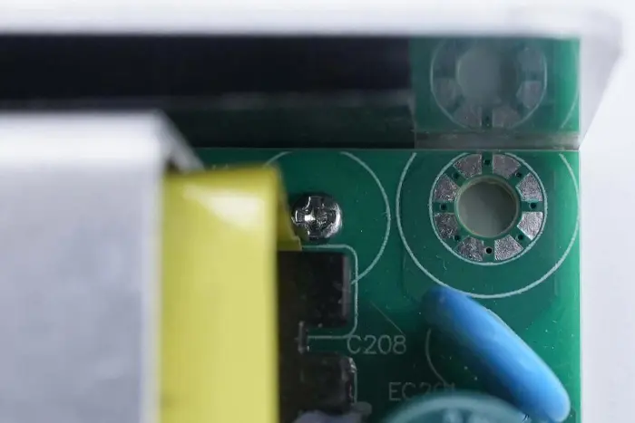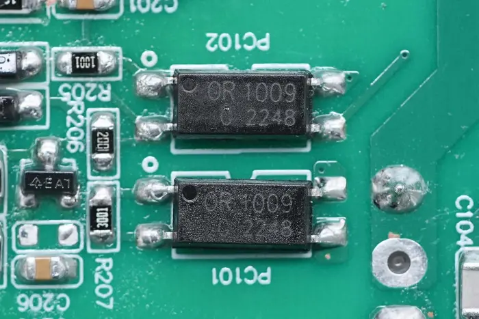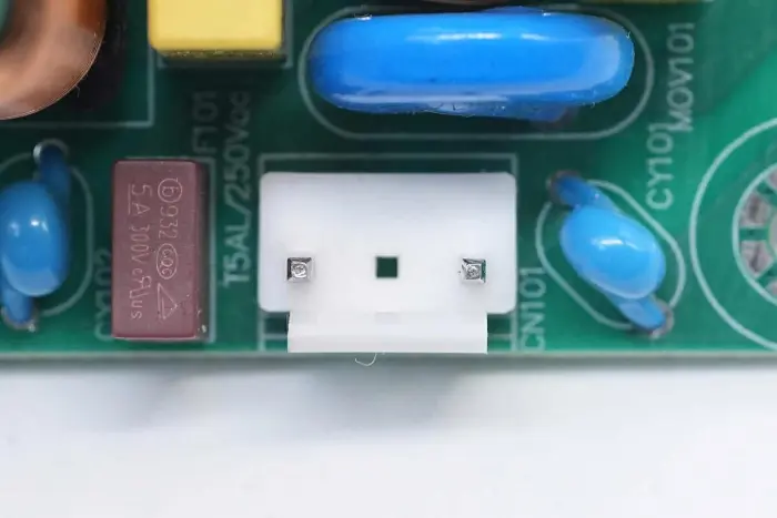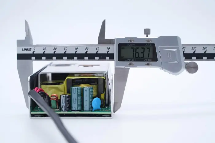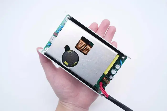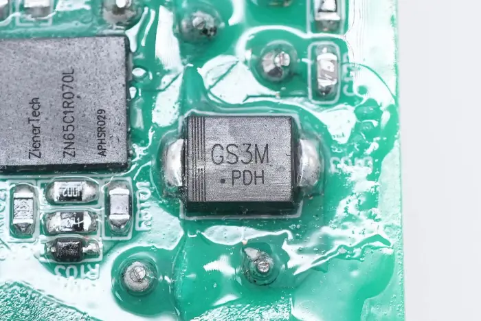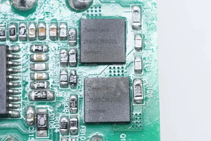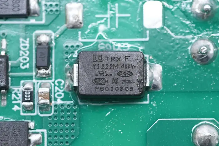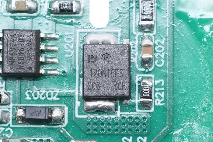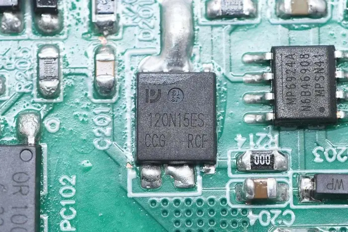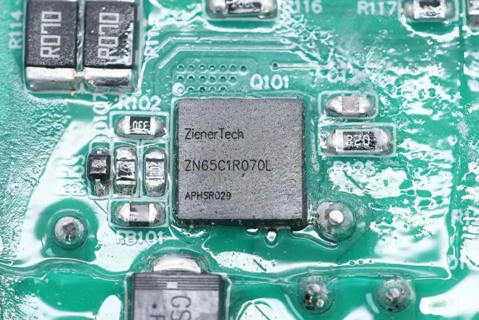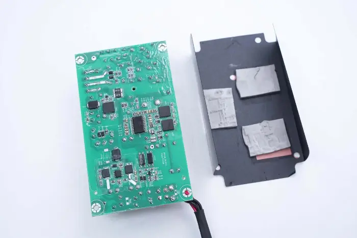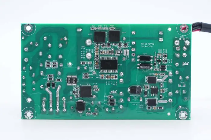 Di bagian belakang modul PCBA, terdapat pengontrol PFC+LLC 2-in-1. Sakelar PFC terletak di kiri bawah, sakelar LLC berada di atas chip kontrol utama, optocoupler umpan balik di sebelah kanan, dan pengontrol penyearah sinkron dan dua penyearah sinkron berada di bawah. Seluruh papan dilapisi dengan lapisan konformal untuk perlindungan.