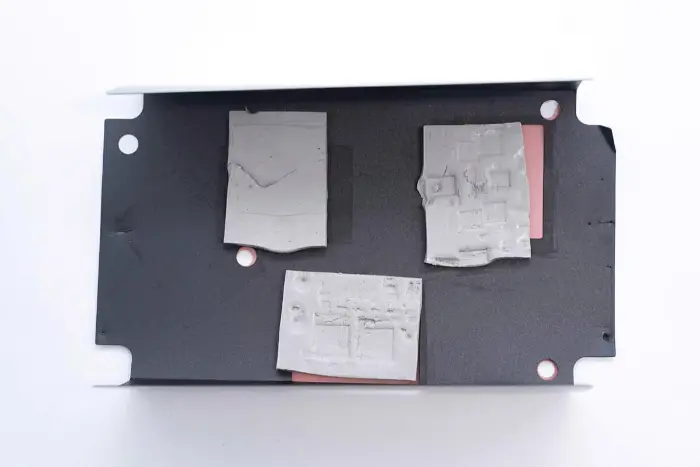 Tiga bantalan termal masing-masing berhubungan dengan sakelar PFC, sakelar LLC, dan penyearah sinkron.