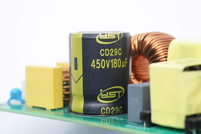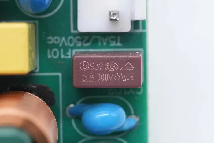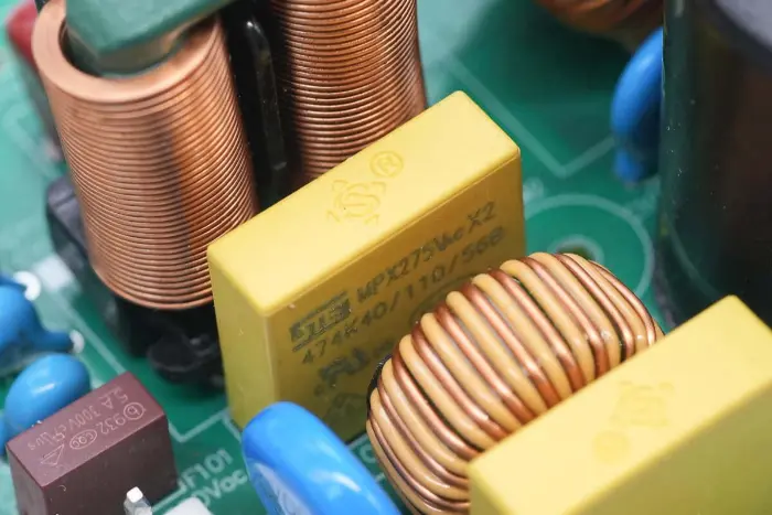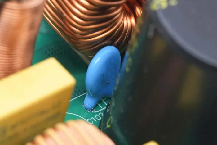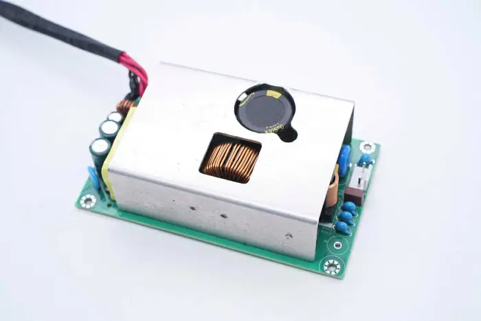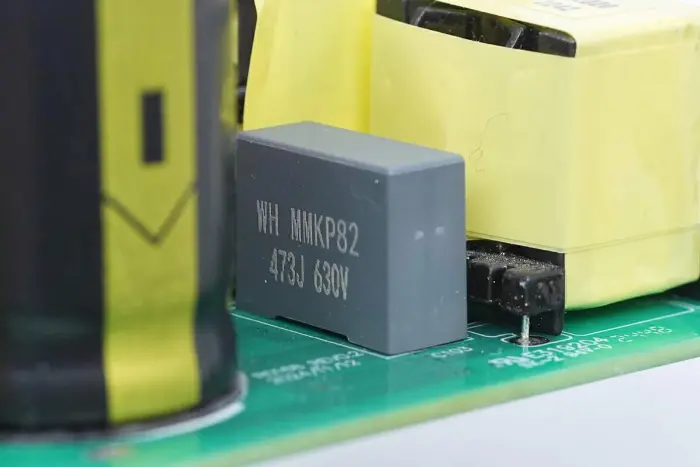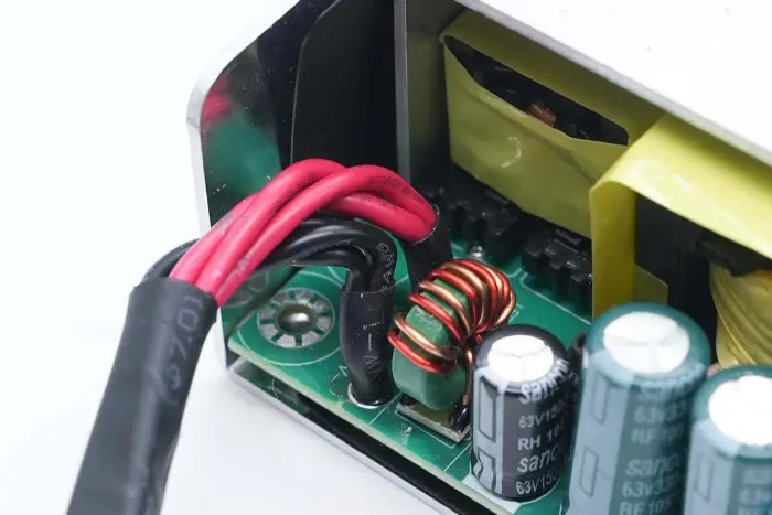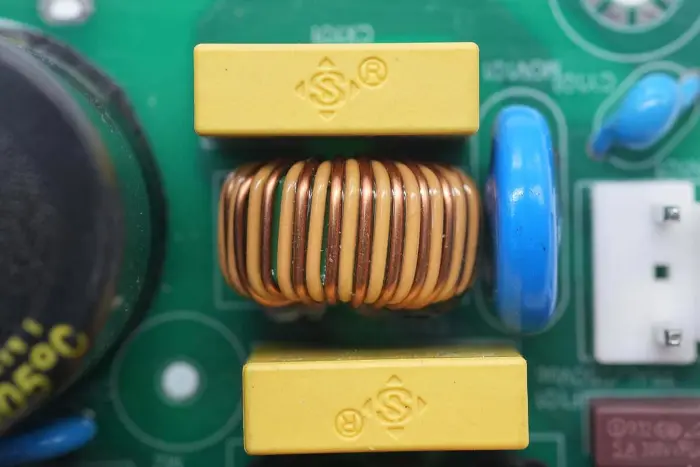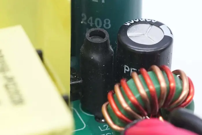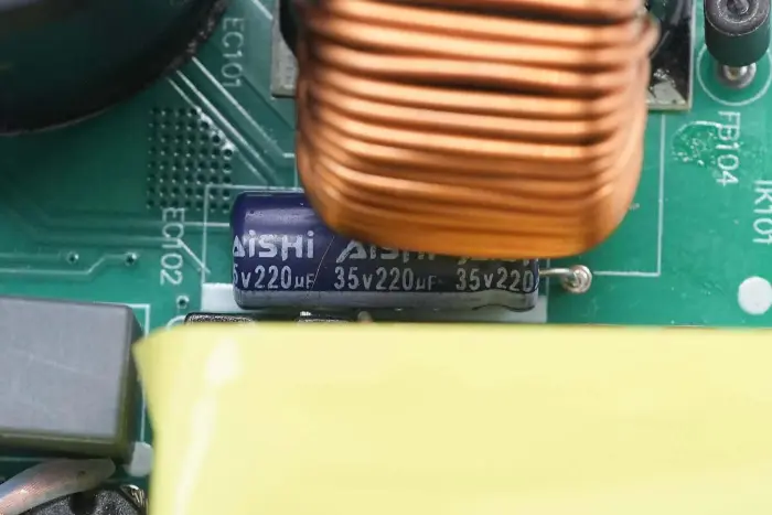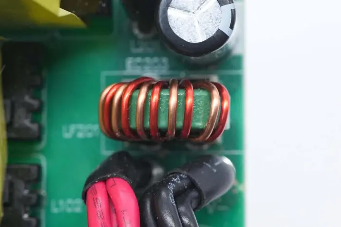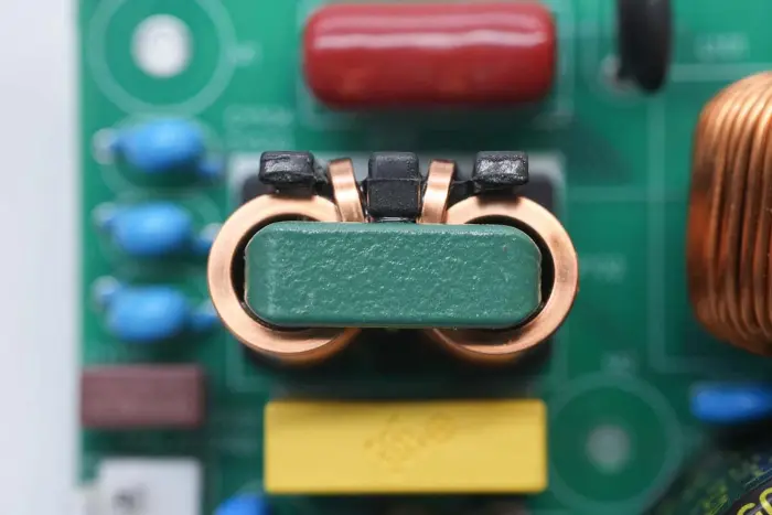 Induktor penguat PFC dililit dengan cincin magnet, dan lembaran Bakelite disediakan di bagian bawah untuk insulasi.