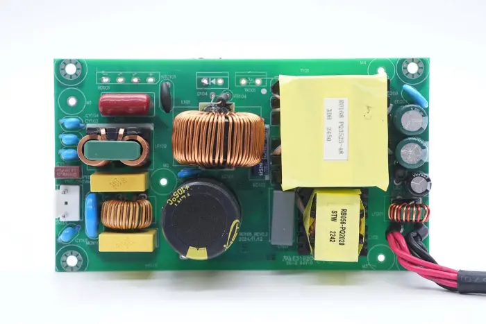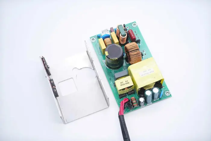 Gambaran umum bagian depan modul PCBA: sisi kiri dilengkapi dengan soket input daya, sekring, kapasitor Y, varistor, induktor mode umum, dan kapasitor pengaman X2. Posisi tengah dilengkapi dengan induktor penambah PFC dan kapasitor filter tegangan tinggi. Sisi kanan dilengkapi dengan kapasitor resonan LLC, induktor resonansi, trafo, kapasitor filter, dan induktor filter.