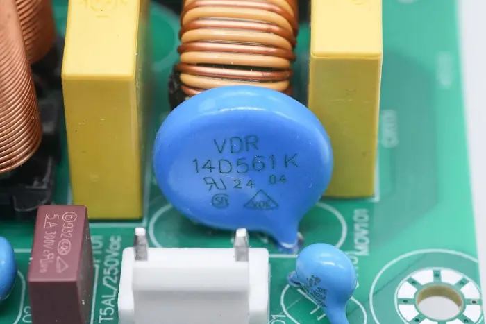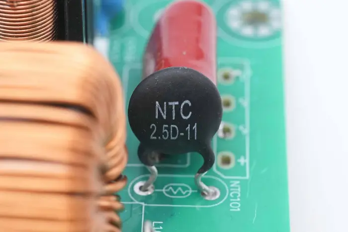 Termistor NTC bertanda 2.5D-11, digunakan untuk menekan arus pengisian kapasitor elektrolitik tegangan tinggi.