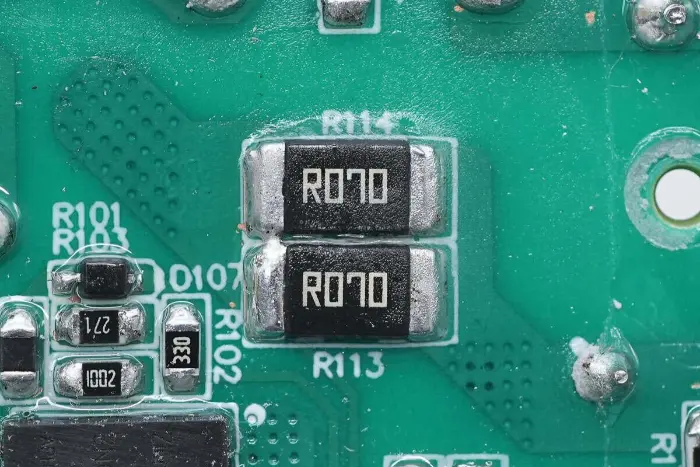 Dua resistor 70mΩ dihubungkan secara paralel untuk mendeteksi arus sakelar.