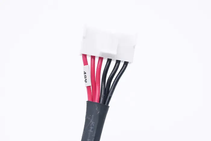 Tampilan dekat dari konektor keluaran: kabel merah adalah kutub positif, dan selongsong ditandai untuk keluaran 48V.