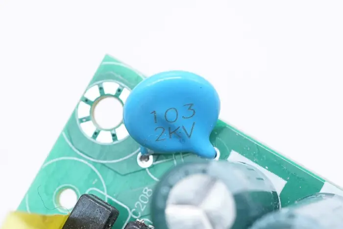 Kapasitor keramik dihubungkan secara paralel dengan kapasitor elektrolitik, dengan spesifikasi 0,01μF 1KV.